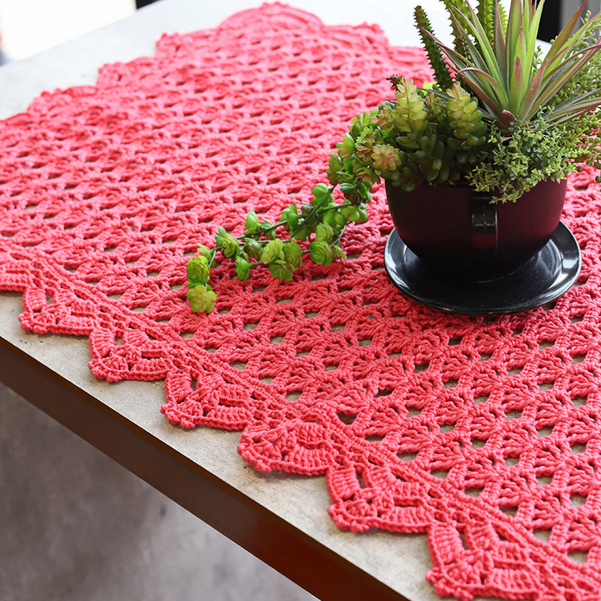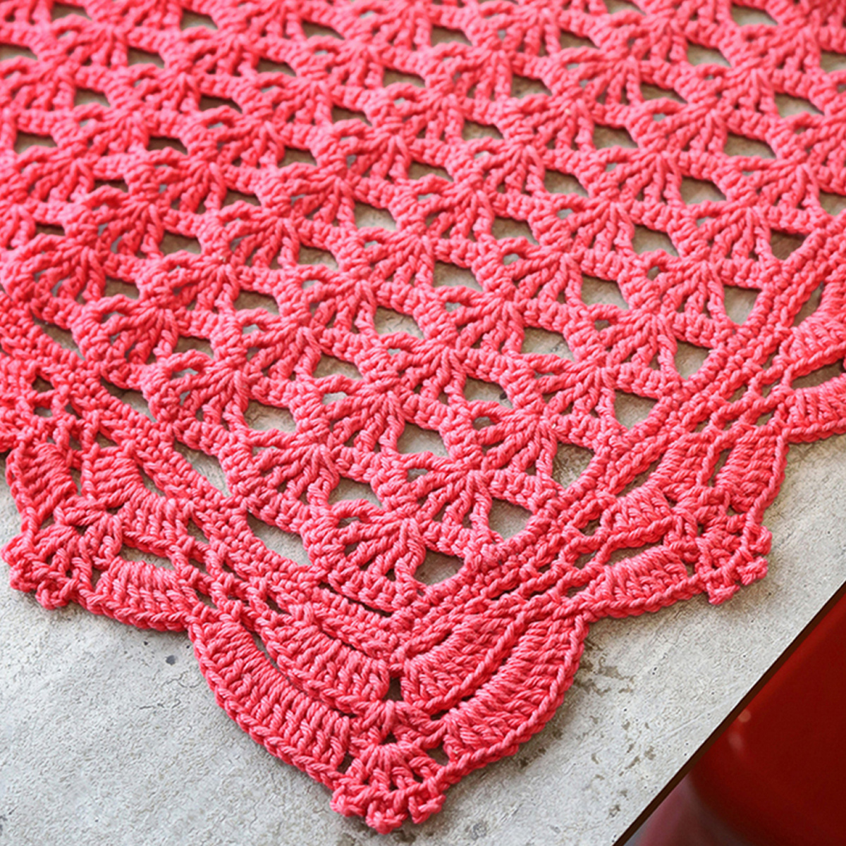 Для вязания нам потребуется 4 мотка кораллово-розовой пряжи: 100% мерсеризованный хлопок; 100 гр — 170 м. Крючок № 3.
