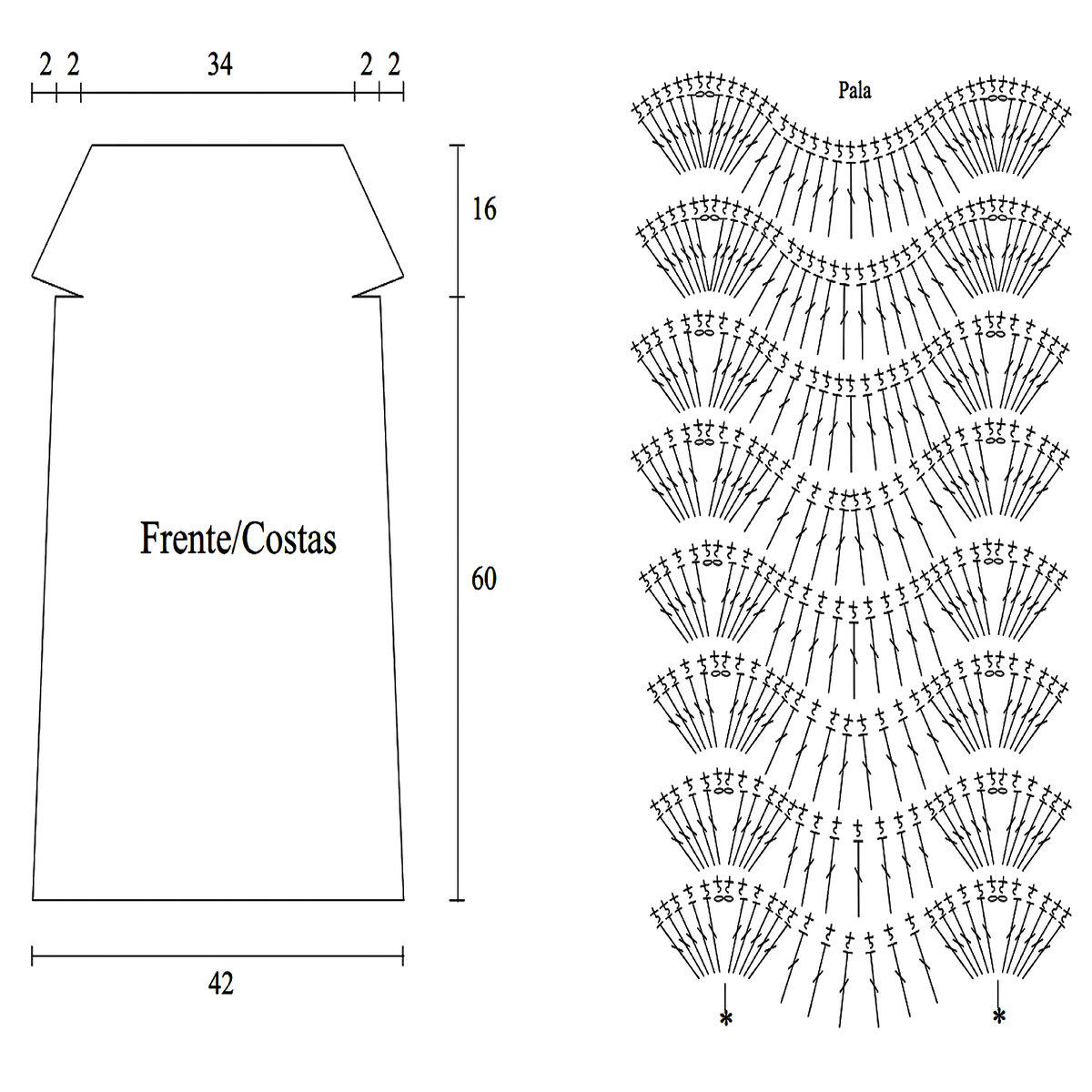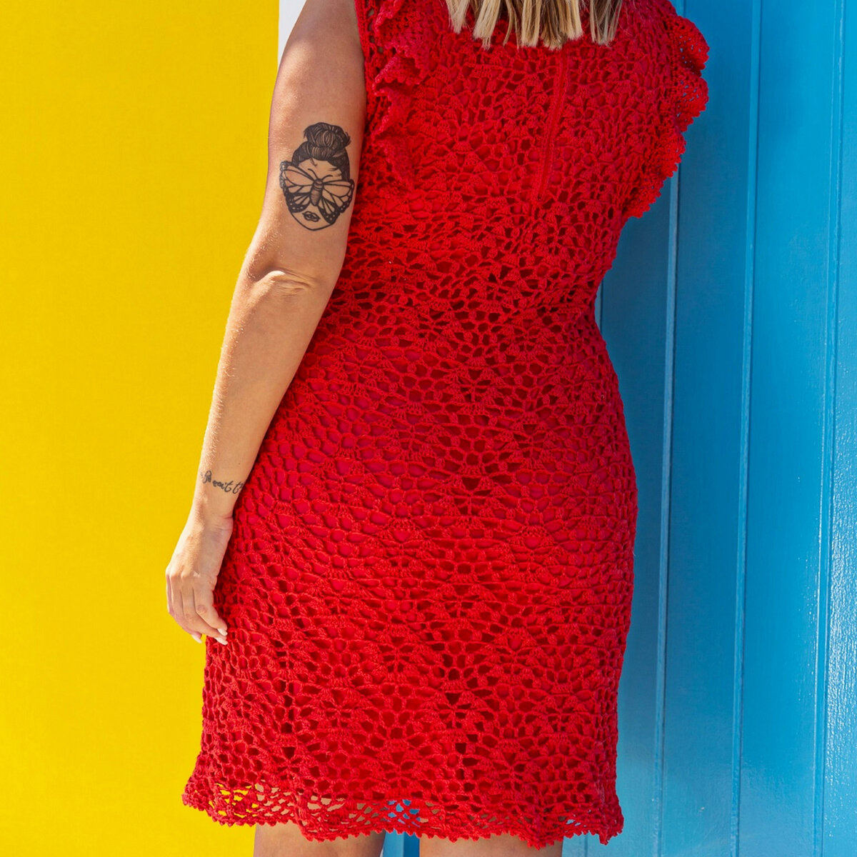 Эффектное бело-красное мини с открытыми плечиками и оригинальным волнистым узором. Издалека узор очень похож на спицевый аналог «павлиний хвост» — я сначала подумала, что это он и есть, пока не увидела фото ближе. Если связать в сине-белой гамме, то будет полная ассоциация с морскими волнами — отличный вариант для отпуска!