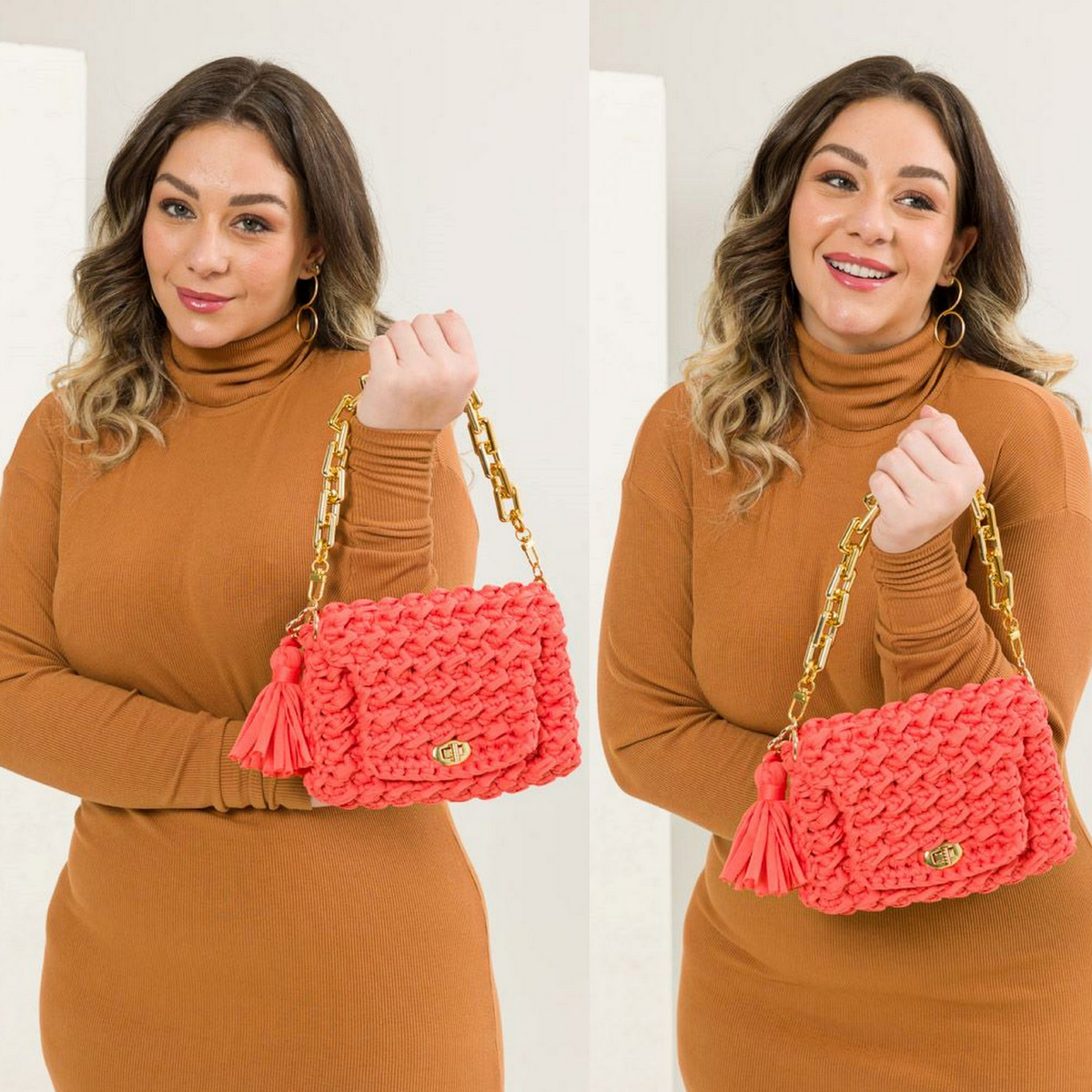Яркая коралловая сумочка-клатч с рельефным узором-плетёнкой. Модель украшена крупной цепочкой-ручкой и пышной кисточкой сбоку. Закрывается такая сумочка на удобный замочек с вертикальной застёжкой. И в театр и на пляж! Размер клатча 12 х 20 см.