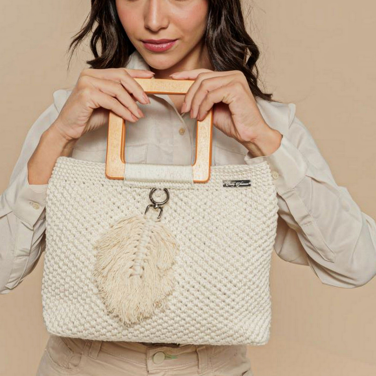 Для вязания нам потребуется 4 мотка натурально-белой пряжи: 100% мерсеризованный хлопок; 100 гр — 100 м. Крючок № 4. А также деревянные квадратные ручки размером 14 х 14 см, прямоугольное основание для сумки бежевого цвета размером 7,4 х 29 см и круглый карабин для «листика» размером 17 х 46 мм.