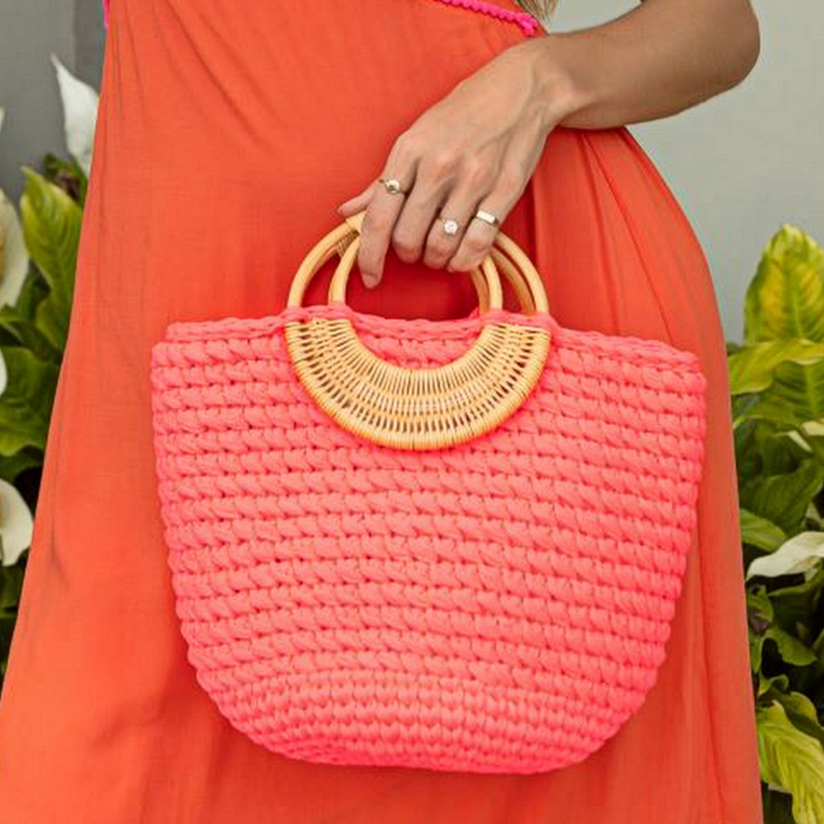 Розово-коралловая сумка-торба с круглыми плетёными ручками из ротанга. Размер торбы 20 х 35 см.