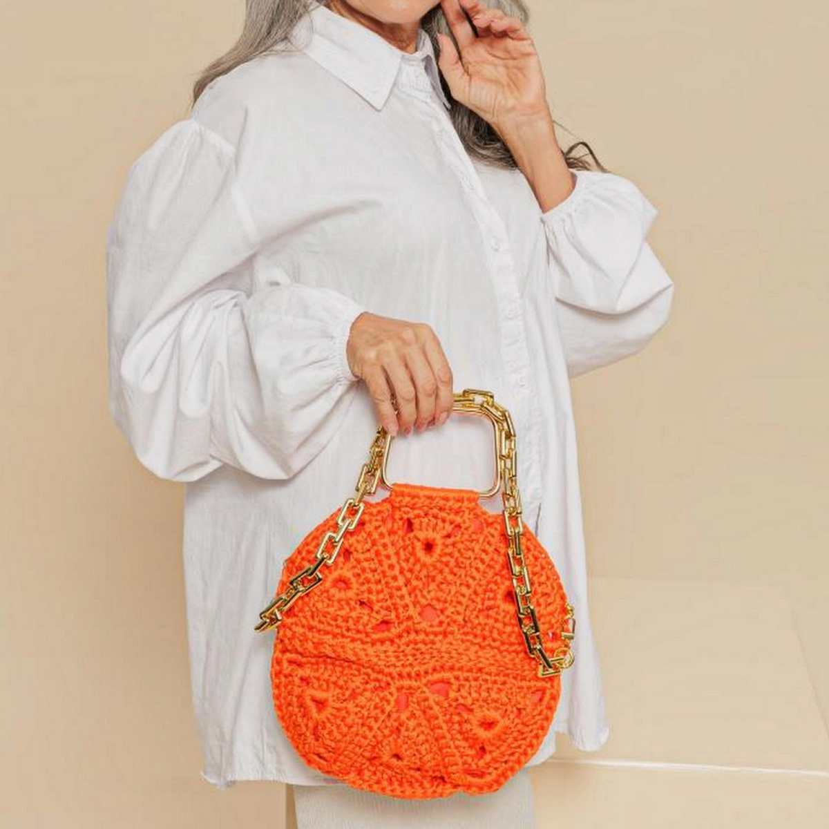 Мандариновая сумочка-мандала даже самый простой ансамбль сделает нарядным! Оригинальный аксессуар круглой формы, связанный из треугольных мотивов. Сумочка украшена двумя видами ручек — металлическими квадратными и цепочкой из крупных звеньев. Размер мандалы 28 см в диаметре.