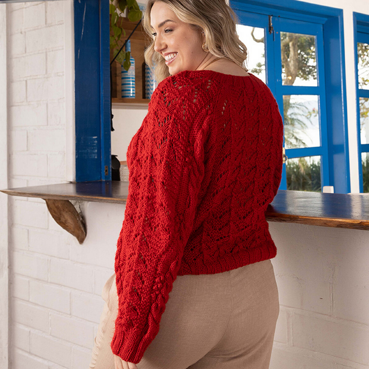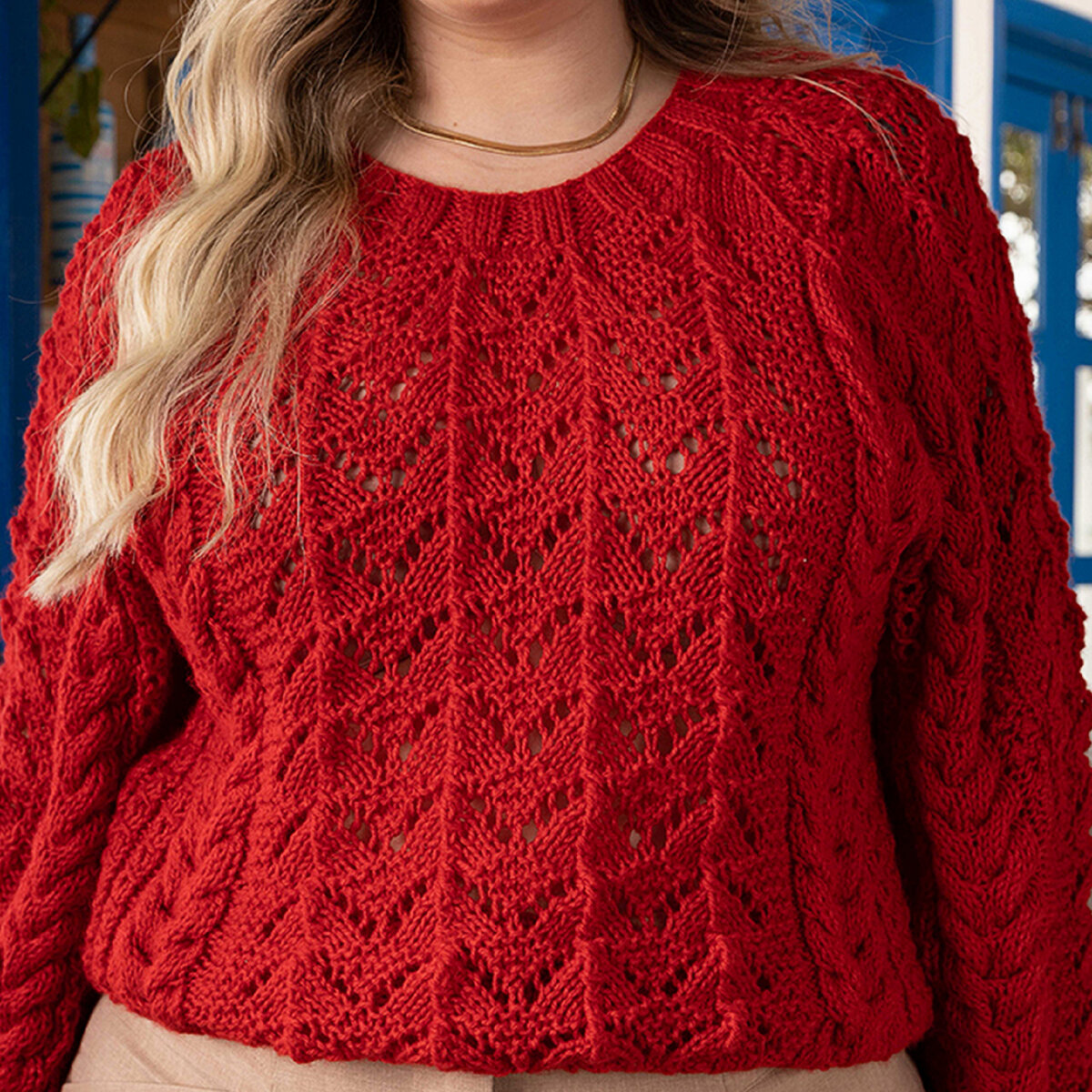 Роскошный алый джемпер оверсайз с россыпью разнообразных узоров — ажурных, рельефных и объёмных. Даже без моих любимых «шишечек» не обошлось. Всё и сразу!