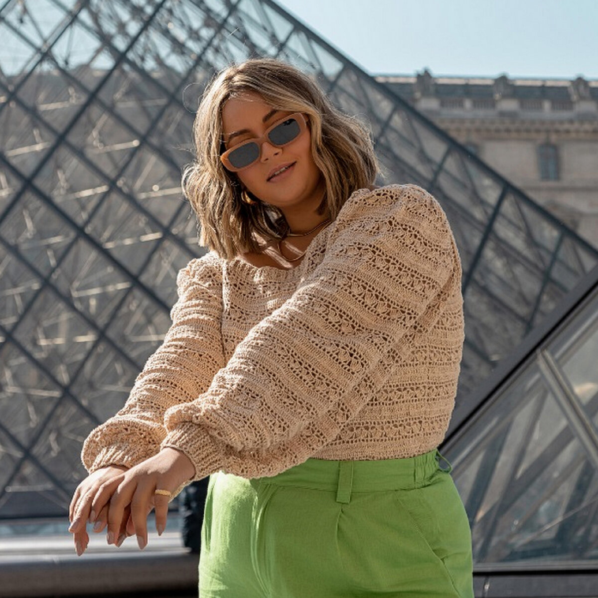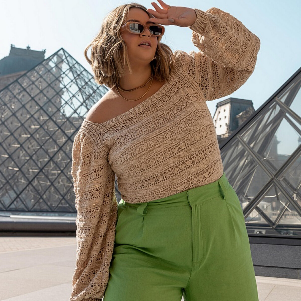 Кремово-бежевый джемпер крючком. Изысканная модель плюс-сайз с открытыми плечиками и пышными рукавами на узкой манжете.