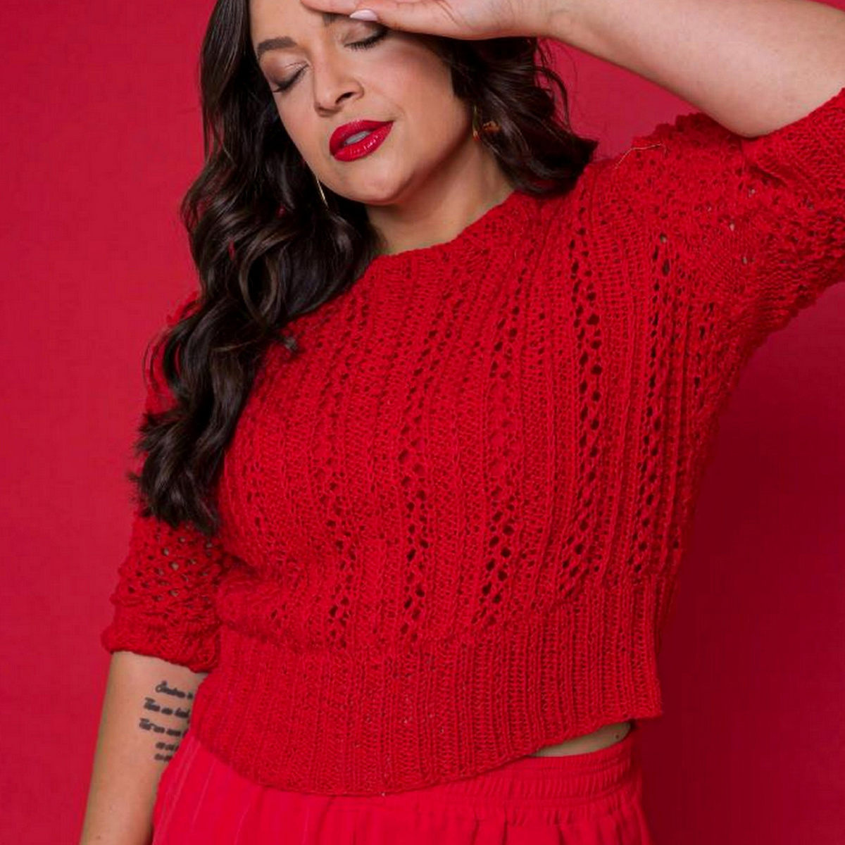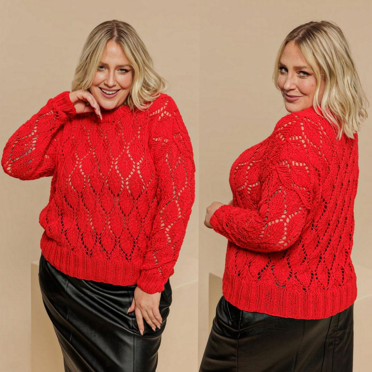 Для вязания нам потребуется 8 мотков красной пряжи: 100% хлопок; 100 гр — 120 м. Спицы № 5 для основного ажурного узора. А также спицы № 4 для вязания резинки внизу, на горловине и манжетах.