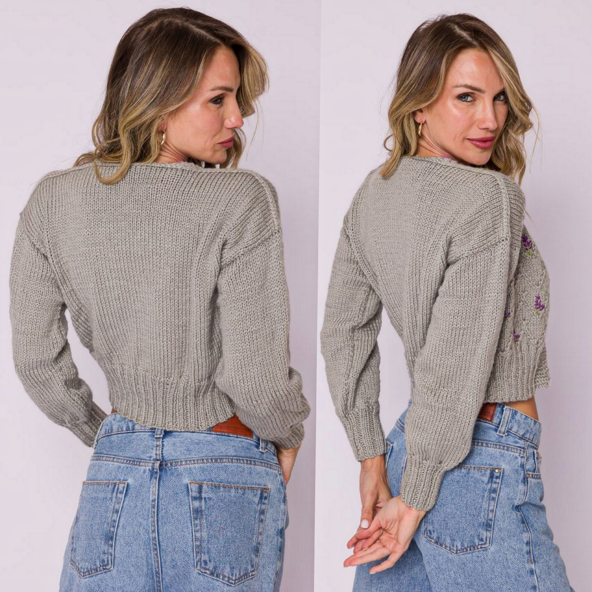 Для вязания нам понадобится 4 мотка серой пряжи: 30% шерсть, 70% акрил; 100 гр — 166 м. Спицы № 6. А также по одной пасме сиреневой и зелёной нити мулине для вышивки. Игла с тупым концом и 4 бледно-сиреневые пуговицы диаметром 1,5 см.