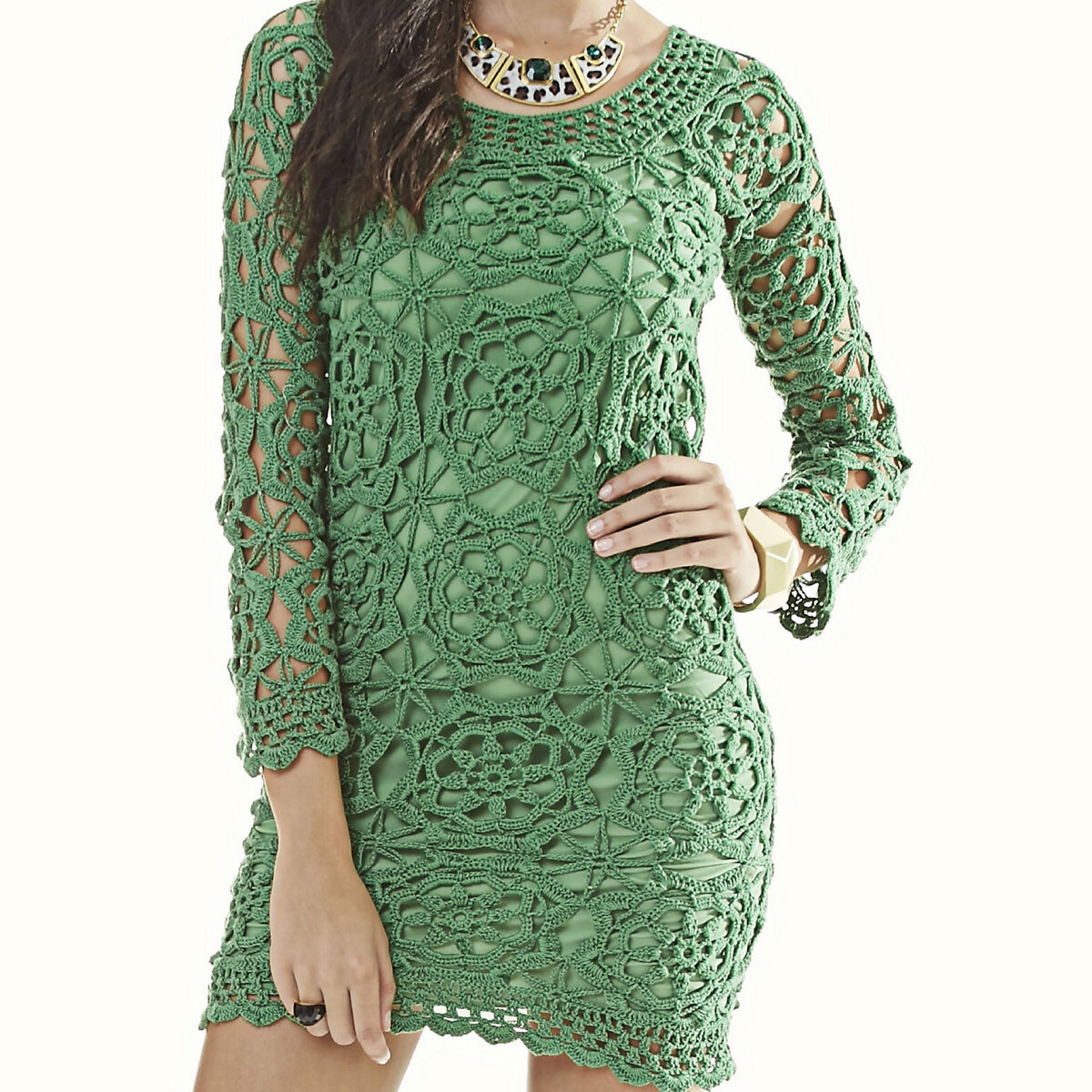 Сочно-зелёное мини из ажурных цветочных мотивов. Освежающая прохлада летнего дня! Широкий круглый вырез, слегка приталенный фасон, узкие рукава три четверти.