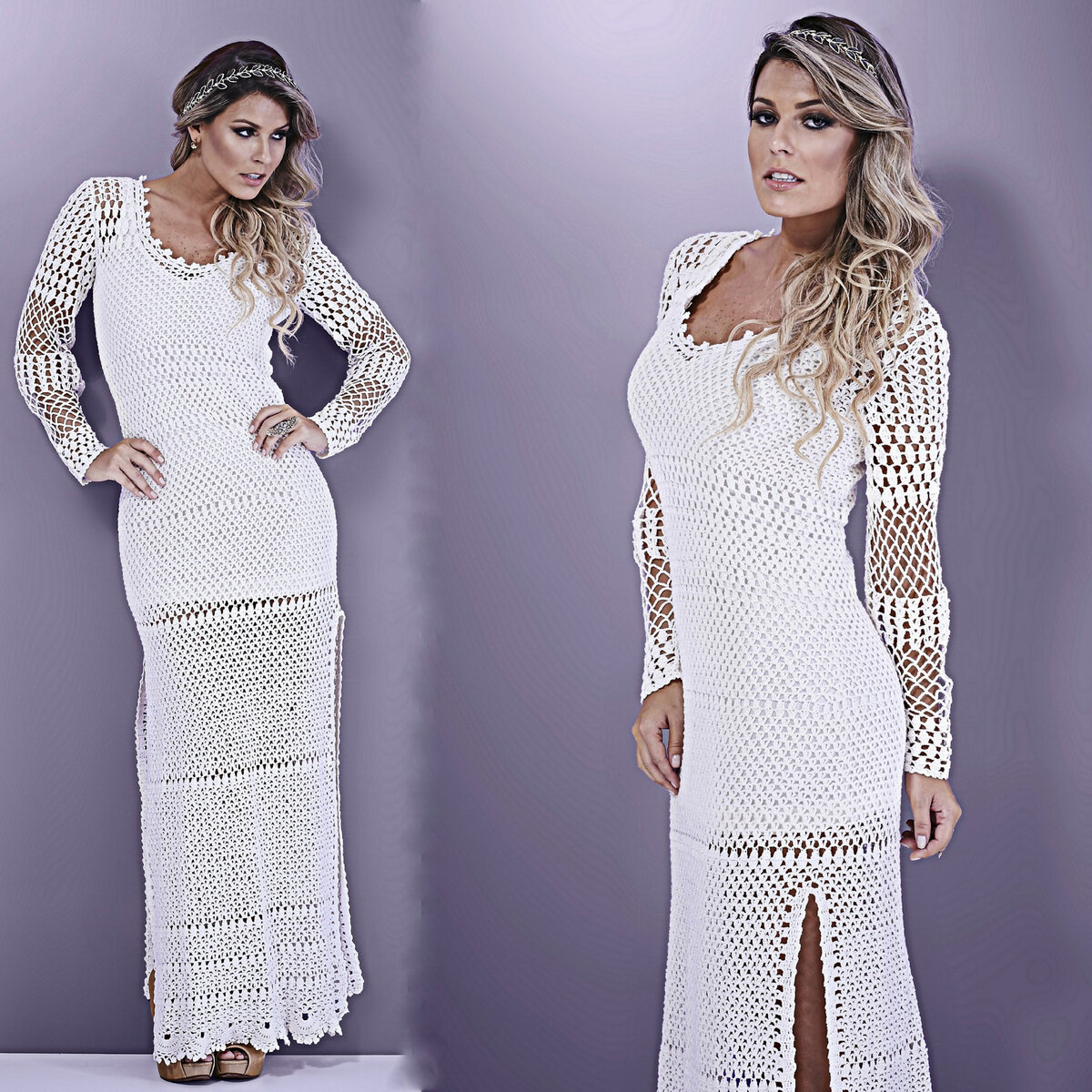 Изысканное белое платье в пол с глубоким V-образным вырезом горловины, узкими кружевными рукавами и боковыми разрезами до середины бедра. Такое элегантное платье вполне может сойти за свадебное. Тем более, что вязаные модели в тренде!