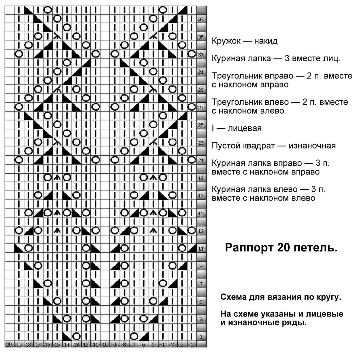 Раппорт узора 20 петель и 38 рядов в высоту. Обратите внимание, что схема для кругового вязания — указаны и лицевые и изнаночные ряды. Если планируете вязать поворотными рядами, добавьте ещё одну петлю к общему количеству — для красивой симметрии. Изнаночные ряды при этом просто вяжите по рисунку, чтобы не путаться по схеме.