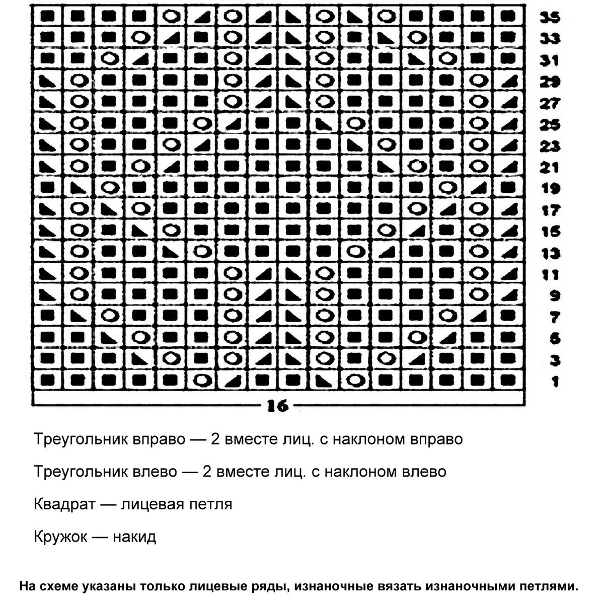 Раппорт узора 16 петель. Схема для кругового вязания — указаны и лицевые, и изнаночные ряды.