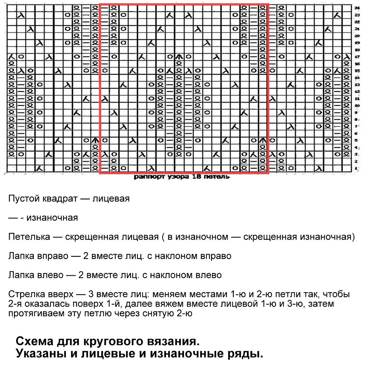 Раппорт узора 18 петель и 24 ряда в высоту. Обратите внимание, что схема для кругового вязания — указаны и лицевые и изнаночные ряды. Если планируете вязать поворотными рядами, добавьте к основному количеству раппортов ещё одну петлю и начинайте вязание петлями до раппорта, заканчивая петлями после раппорта, указанного на схеме. Изнаночные ряды при поворотном вязании вяжутся по рисунку (скрещенные лицевые — скрещенными изнаночными).