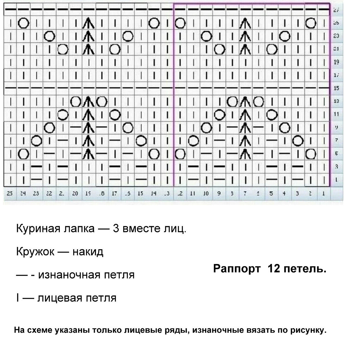 Раппорт узора 12 петель (если планируете вязать поворотными рядами, добавьте ещё одну петлю к общему количеству — для красивой симметрии узора) и 28 рядов в высоту. На схеме указаны только лицевые ряды (нечётные), изнаночные (чётные) вязать по рисунку: где будет лицевая вязать лицевой, где изнаночная — изнаночной, накиды изнаночными петлями.