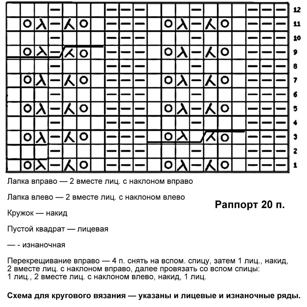 Раппорт узора 20 петель и 12 рядов в высоту. Схема для кругового вязания — указаны и лицевые и изнаночные ряды. Если планируете вязать поворотными рядами, добавьте к общему количеству раппортов ещё 3 петли и заканчивайте ряд 3 изнаночными. Изнаночные (чётные ряды) при поворотном вязании вяжутся по рисунку.