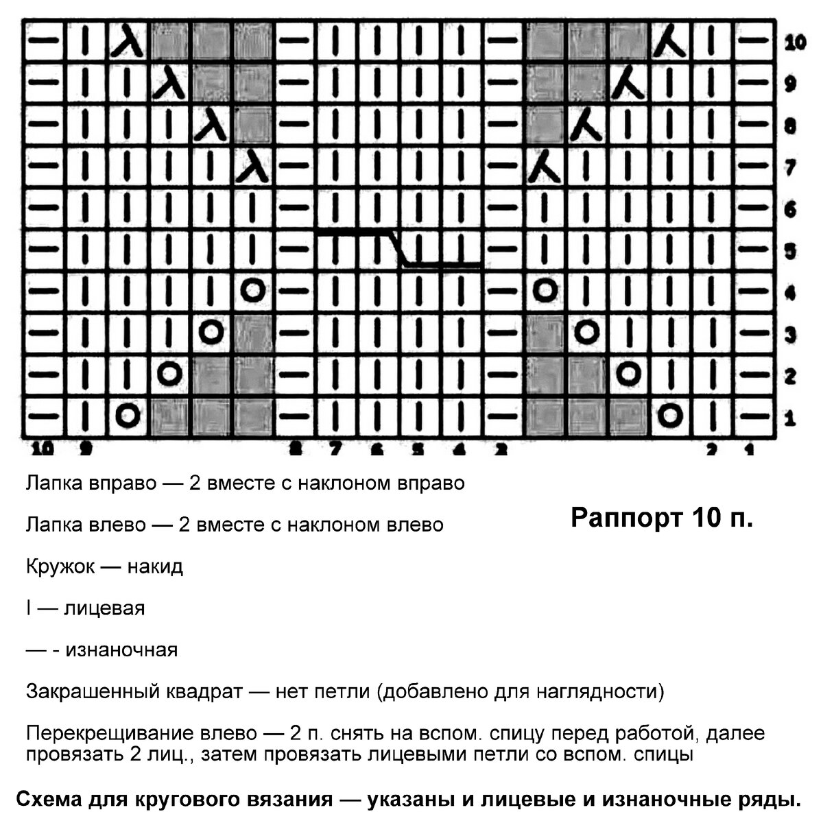 Раппорт узора всего 10 петель и 10 рядов в высоту. Схема для кругового вязания — указаны и лицевые и изнаночные ряды. Если планируете вязать поворотными рядами, то отзеркаливайте условные обозначения в изнаночных (чётных) рядах: где будет указана лицевая, вяжите изнаночную; где изнаночная — лицевую; накиды изнаночными; 2 вместе лицевой с наклоном вправо вязать как 2 вместе изнаночной с наклоном влево; 2 вместе лицевой с наклоном влево — 2 вместе изнаночной с наклоном вправо.