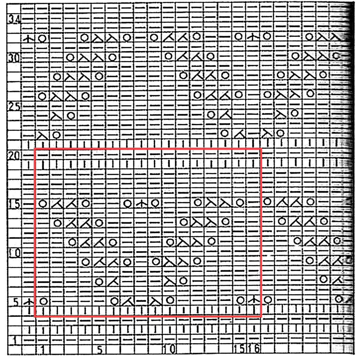 Раппорт узора всего 16 петель и 32 ряда в высоту. Если планируете вязать поворотными рядами, добавьте ещё одну петлю к общему количеству и начинайте вязанием петлями до раппорта, заканчивая петлями после раппорта, указанными на схеме. Схеме указаны только нечётные (лицевые) ряды, чётные (изнаночные) вязать по рисунку.