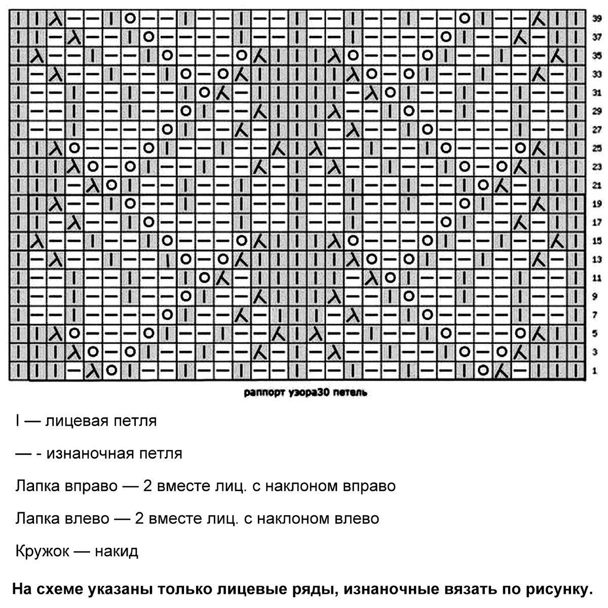 Раппорт узора 30 петель и 40 рядов в высоту. Схема для поворотного вязания — указаны только лицевые ряды, изнаночные вязать по рисунку. Если планируете вязать поворотными рядами, добавьте ещё одну петлю к общему количеству — для красивой симметрии.