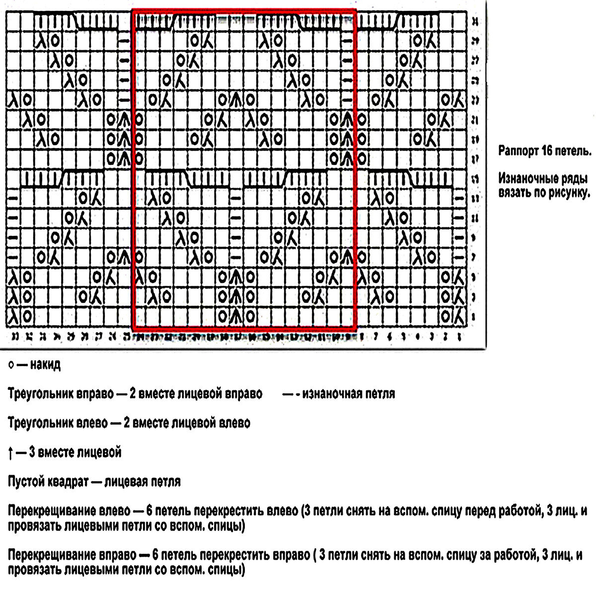 Раппорт узора 16 петель и 36 рядов в высоту. На схеме указаны только нечётные (лицевые) ряды, чётные (изнаночные) вязать изнаночными петлями, накиды также изнаночными. При круговом вязании чётные ряды вяжутся лицевыми петлями и накиды, соответственно, тоже лицевыми.
