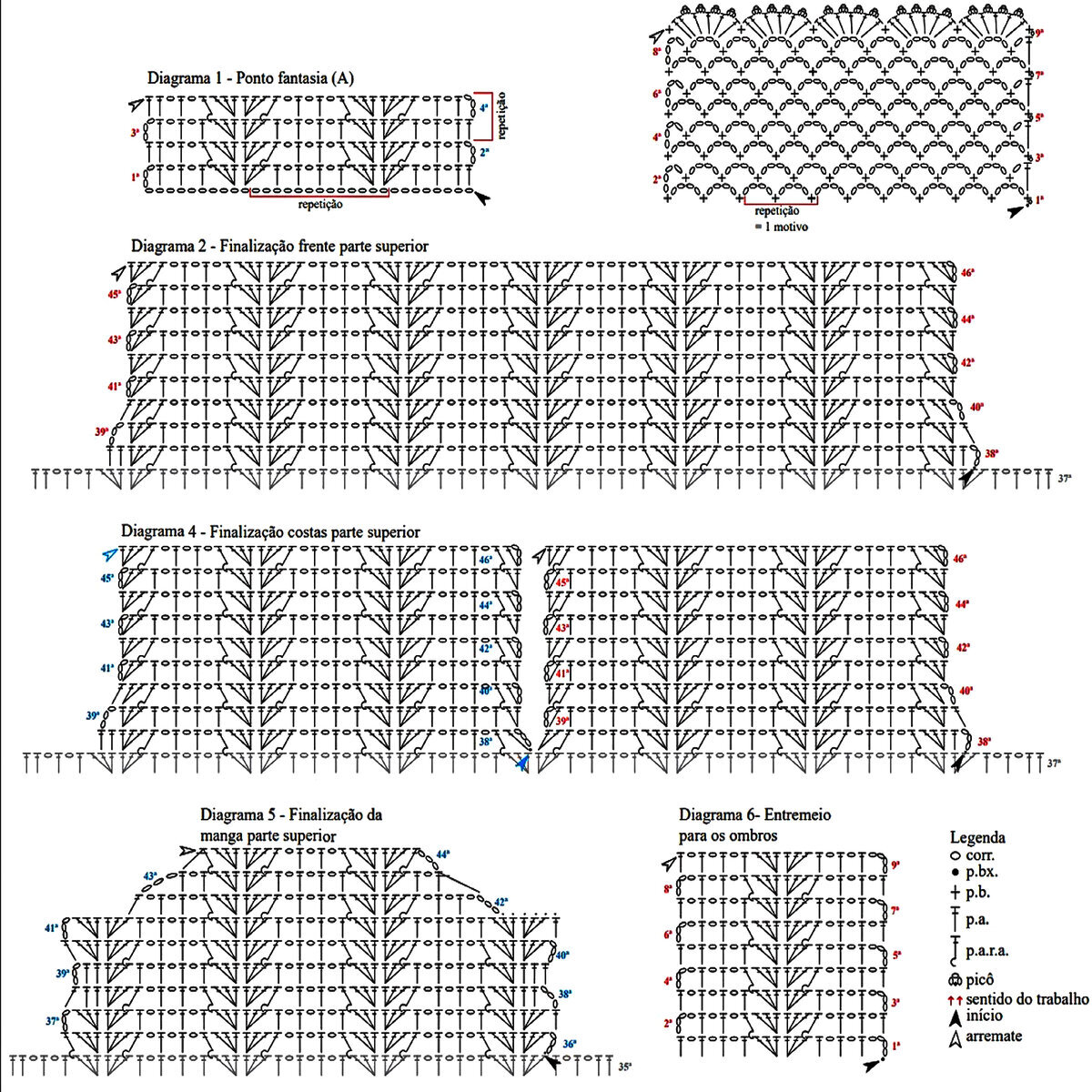 - На рукавах идёт несколько ажурных узоров: низ рукава и область выше локтя — это вариации второго узора, если вы посмотрите внимательно. Раппорт узора 8 петель и 20 рядов в высоту. На схеме указаны только лицевые (нечётные) ряды, изнаночные (чётные) вязать изнаночными петлями.