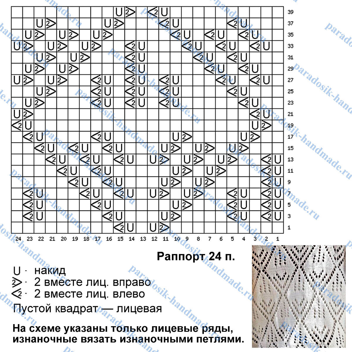 Раппорт узора 24 петли и 40 рядов в высоту. На схеме указаны только лицевые (нечётные) ряды, изнаночные (чётные) вязать изнаночными петлями.