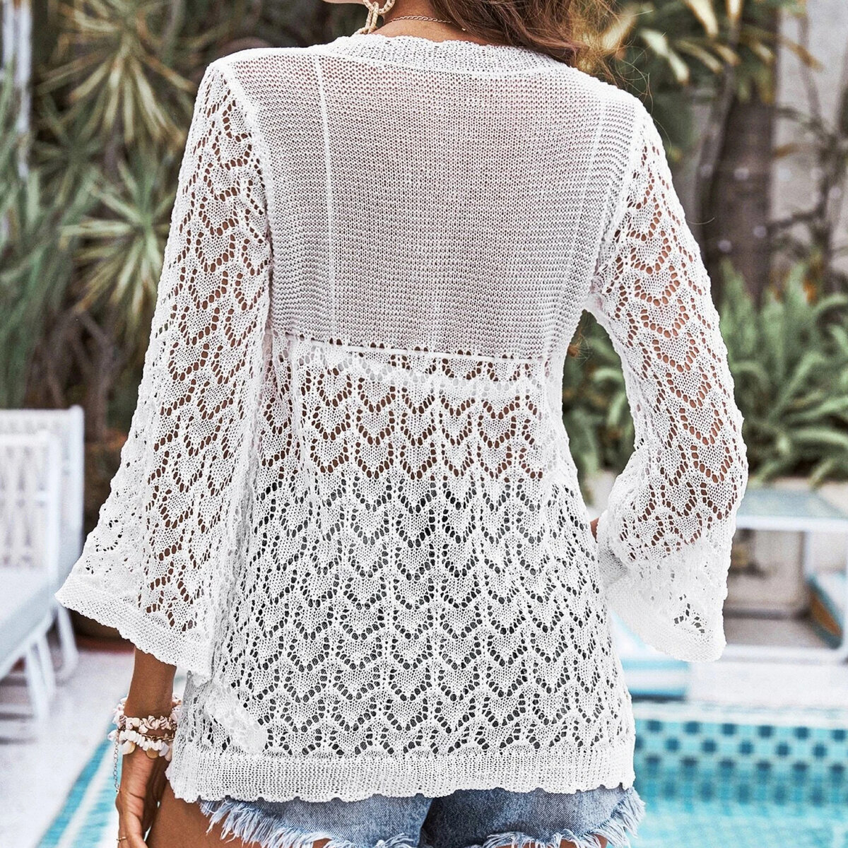 Воздушный кардиган спицами на кулиске от китайского бренда Shein. Невесомая модель до середины бедра, V-образный вырез горловины, широкий втачной рукав три четверти, простой ажурный узор и рельефный узор в рубчик вверху кардигана. Оригинальный волнистый край.