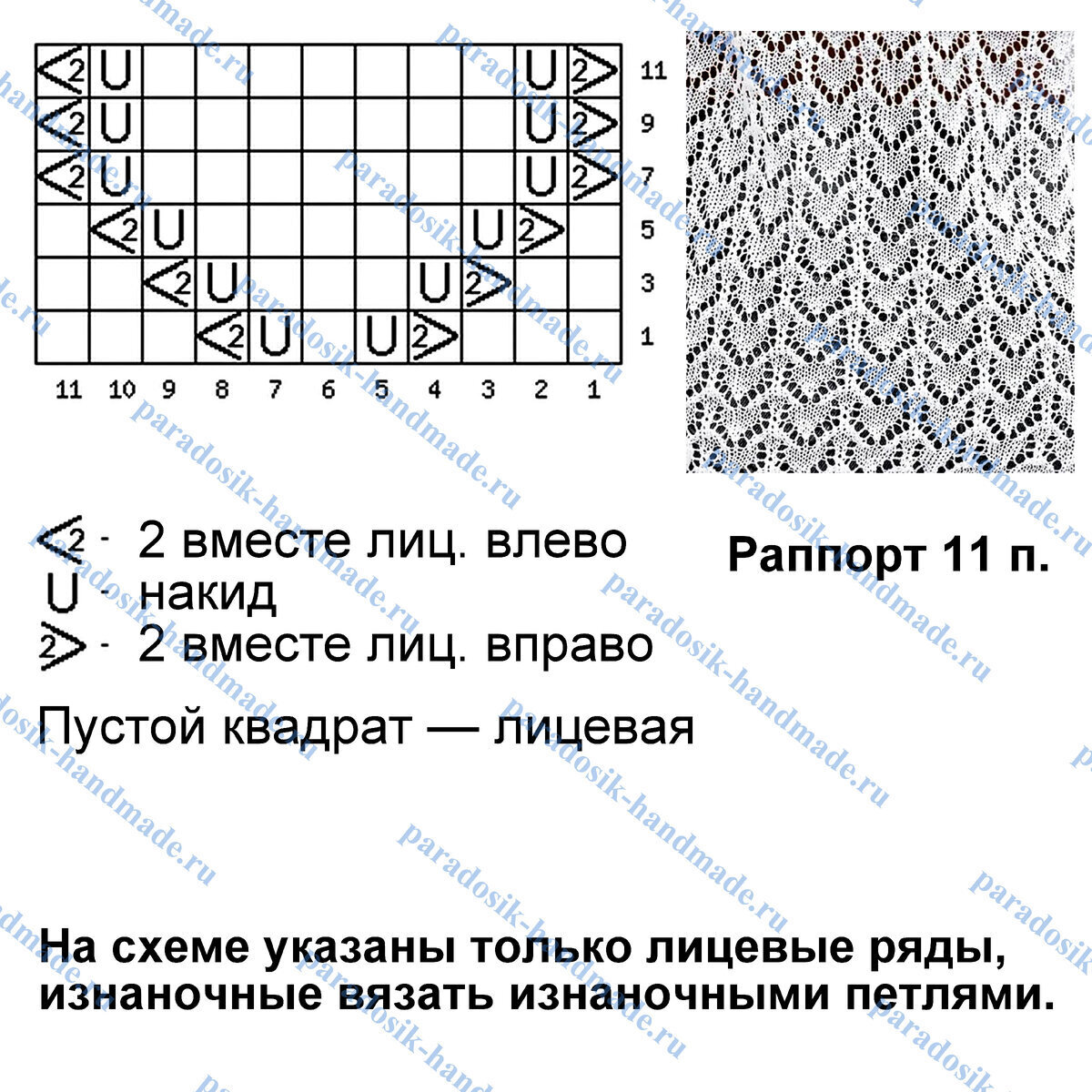 Раппорт узора 11 петель и 12 рядов в высоту. На схеме указаны только лицевые (нечётные) ряды, изнаночные (чётные) вязать изнаночными петлями.