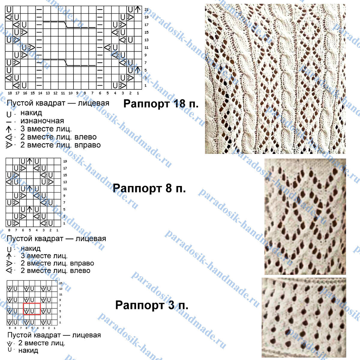 При вязании поворотными рядами рекомендую добавить ещё 5 петель к общему количеству раппортов — для красивой симметрии узора. Также необходимо отзеркаливать условные обозначения в изнаночных (чётных) рядах: где на схеме указана лицевая, вязать изнаночной; где изнаночная — лицевой; 2 вместе лицевой вправо вязать как 2 вместе изнаночной влево; 2 вместе лицевой влево как 2 вместе изнаночной вправо; 3 вместе лицевой — 3 вместе изнаночной.