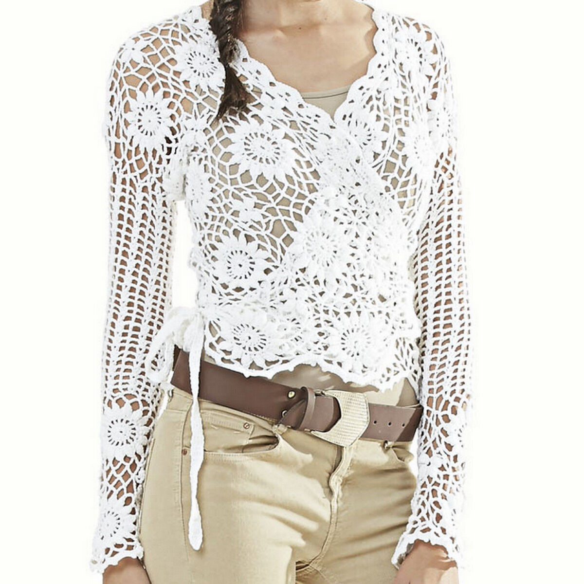 Кружевная блузка крючком на запах. Длинные узкие рукава, вырез, украшенный зубчатой каймой и классическое сочетание цветочных мотивов и ажурной сеточки.
