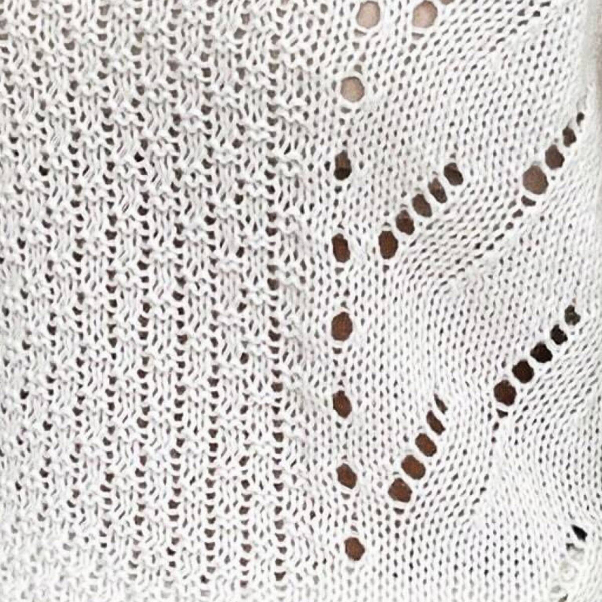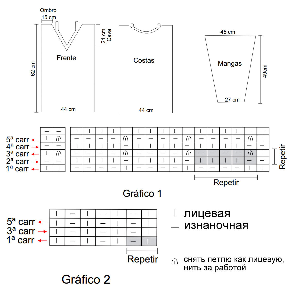 - Вверху рукава и между ажурными узорами идёт платочка (и в лицевых, и в изнаночных рядах вяжем изнаночными петлями), далее лицевая гладь.