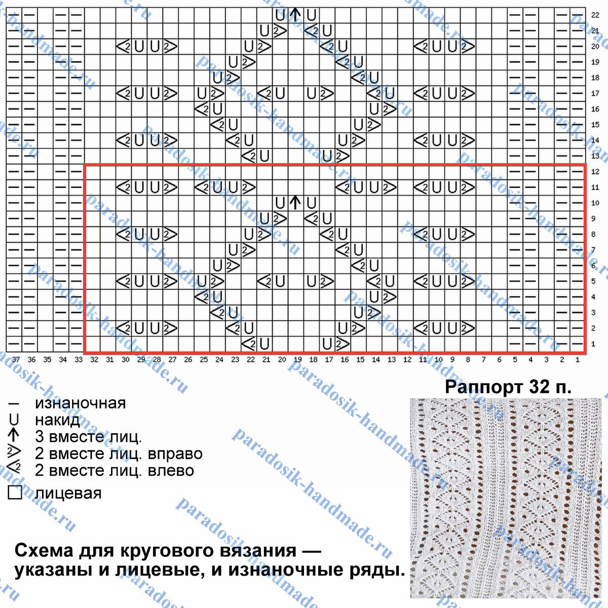 Раппорт узора 32 петли и 12 рядов в высоту. Схема для кругового вязания — указаны и лицевые (нечётные), и изнаночные (чётные) ряды.