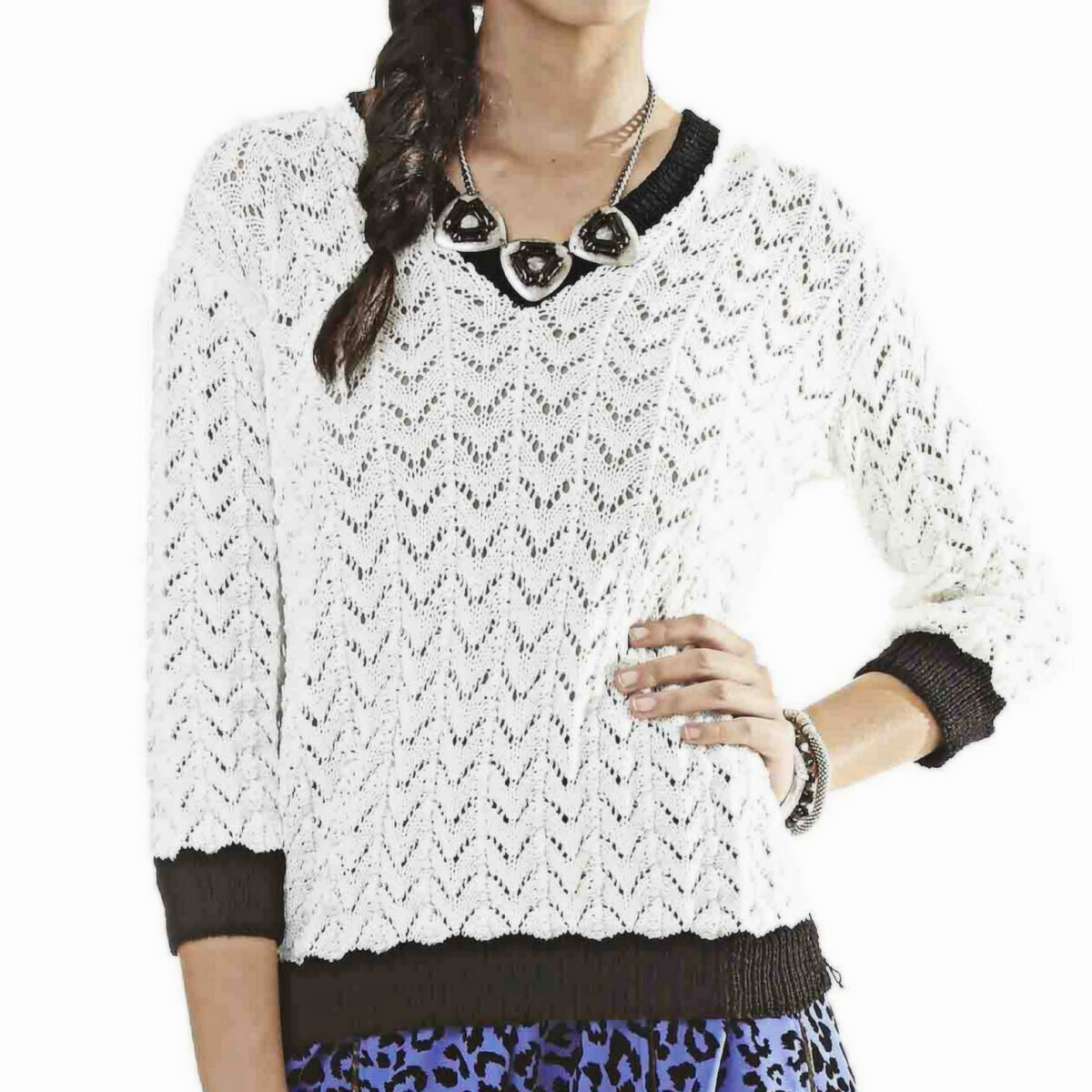 Чёрно-белая классика — ажурный пуловер спицами в стиле Коко Шанель. Прямой фасон, втачной рукав три четверти и небольшой V-образный вырез горловины.