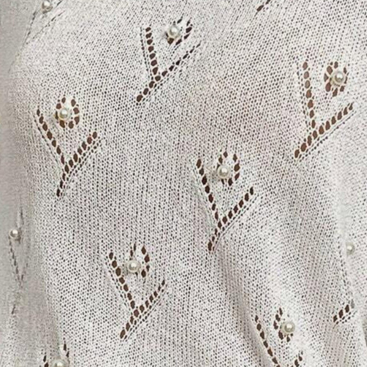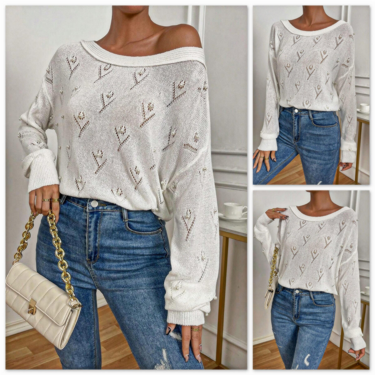 Пуловер с бусинами от китайского бренда Shein. Модель оверсайз, прямой удлинённый фасон а-ля «наволочка», глубокий вырез лодочкой, спущенная линия плеча, рукав трубой на узкой манжете-резинке. Простой ажурный узор, напоминающий цветок, украшенный крупной перламутровой бусиной.