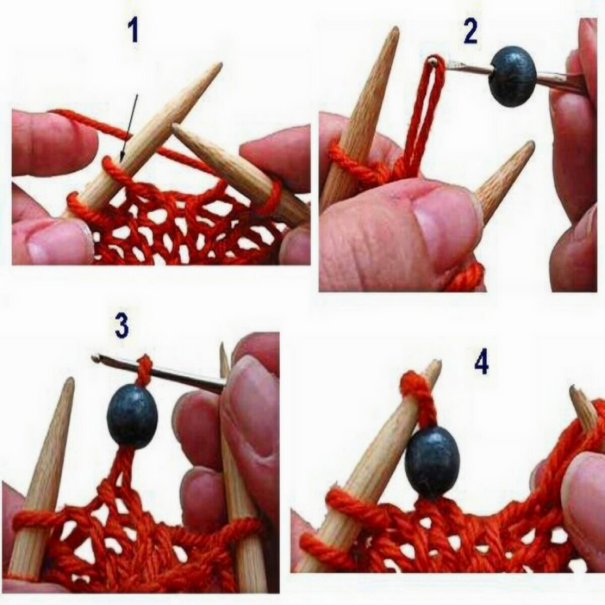 После резинки внизу переходим на основной ажурный узор — он очень простой, справится даже новичок. Бусины в цветках можно пришить потом, а можно ввязывать их сразу, в процессе (как это сделать — смотрите на фото ниже).