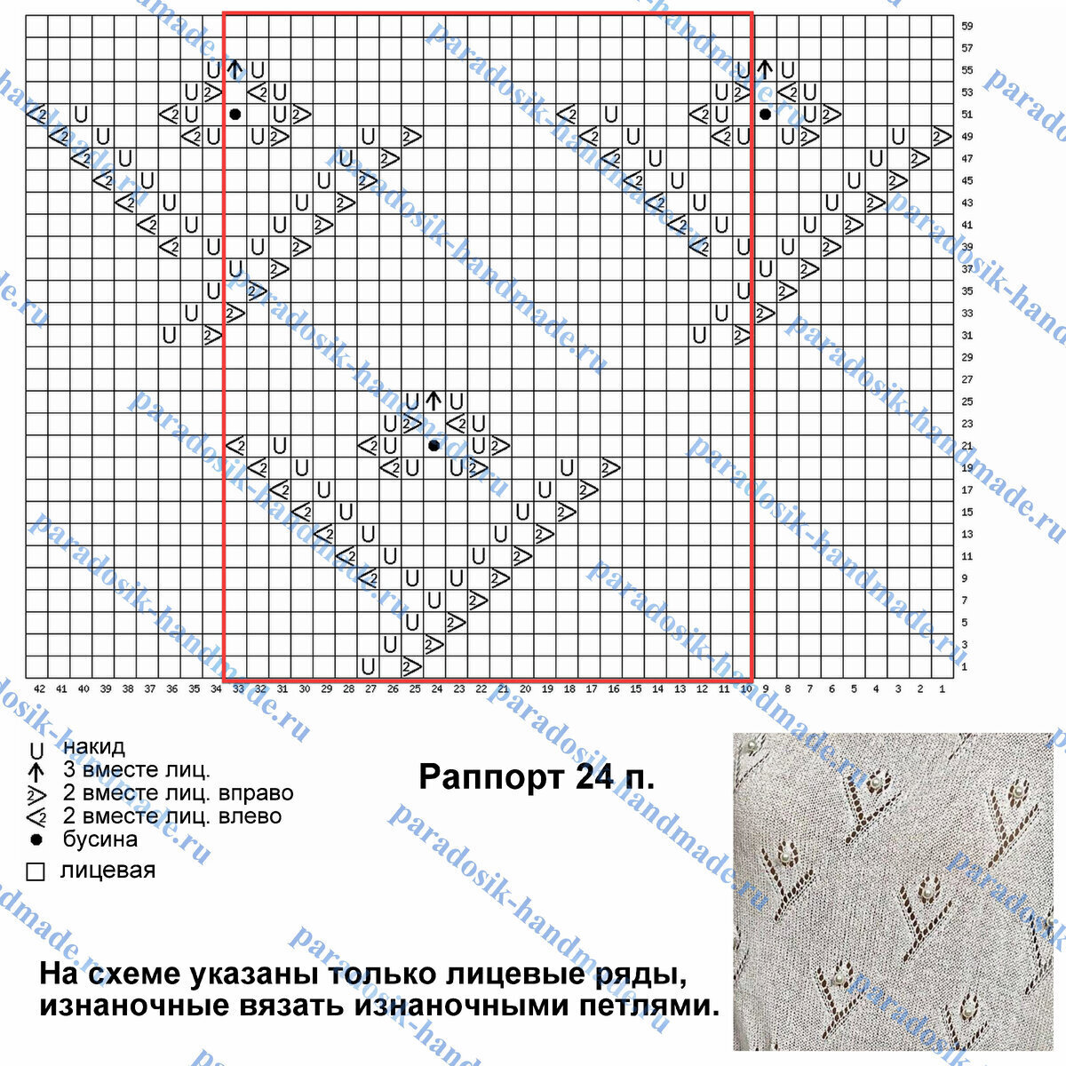 Раппорт узора 24 петли и 60 рядов в высоту. На схеме указаны только лицевые (нечётные) ряды, изнаночные (чётные) вязать изнаночными петлями.