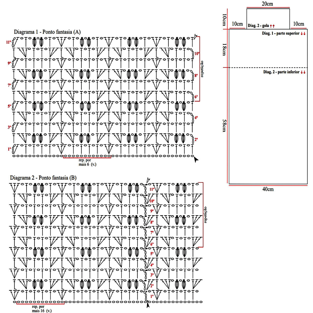 - Основной ажурный узор кардигана, который идёт на спинке и переде — ажурные ромбы, между которыми объёмные жгуты (перекрещивание влево: 4 петли снять на вспомогательную спицу перед работой, далее провязать 3 лицевые, затем лицевыми снятые 4 петли). Раппорт узора 18 петель и 22 ряда в высоту. На схеме указаны только лицевые (нечётные) ряды, изнаночные (чётные) вязать по рисунку.