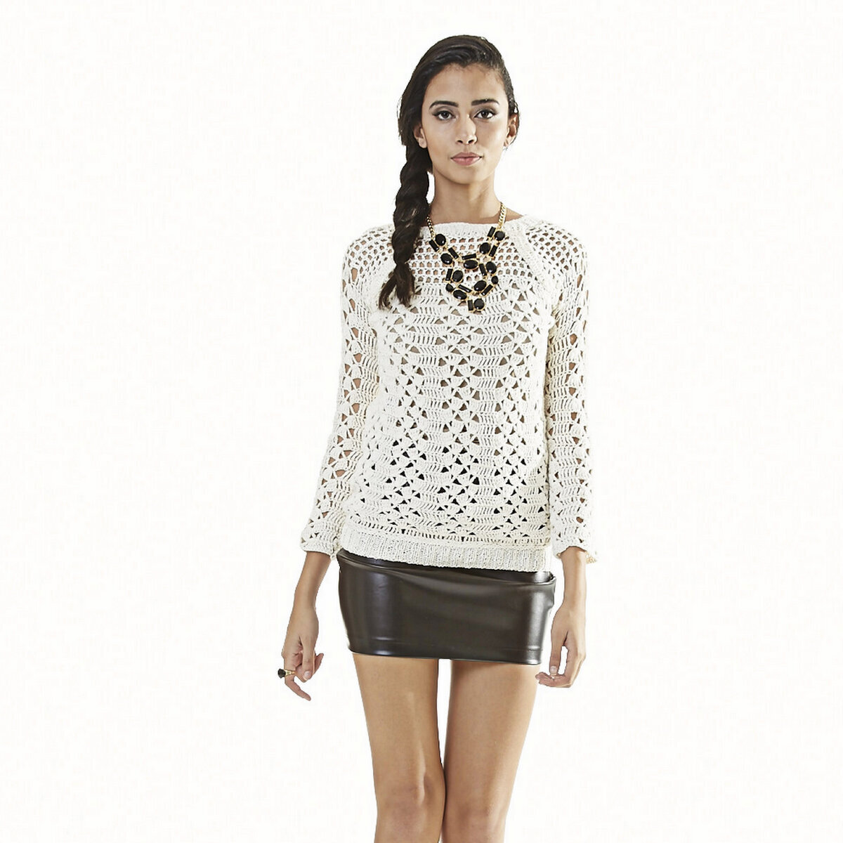 Элегантный джемпер крючком натурально-белого цвета. Крупный сетчатый верх и низ с интересным ажурным узором «веера». Прямой фасон чуть ниже пояса, длинный узкий рукав-реглан и вырез лодочкой.
