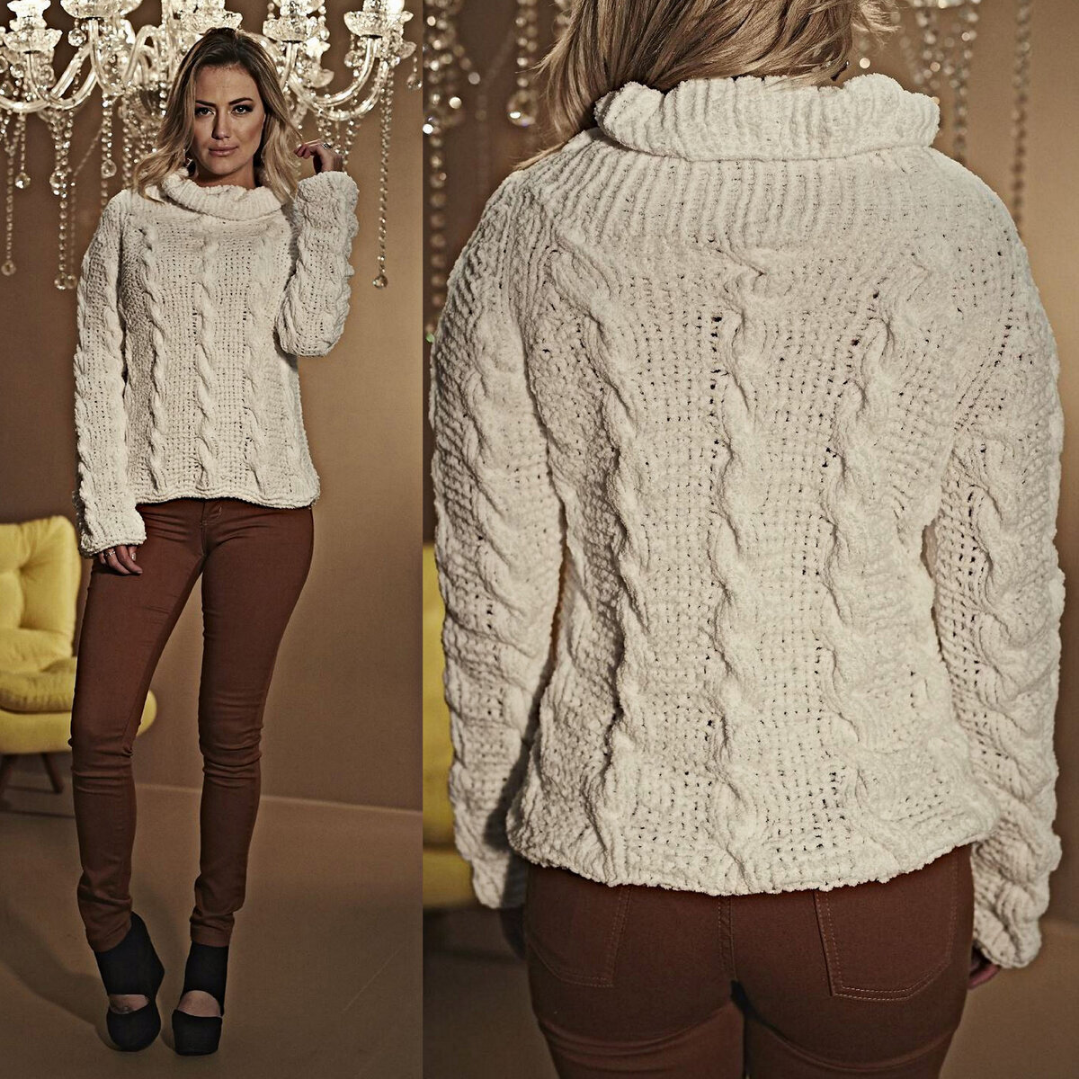 Уютный объёмный свитер спицами с большим воротом-хомутом натурально-белого цвета. Мягкий и бархатистый, так как связан из велюровой пряжи. Модель свободного кроя до бедер, широкие рукава-реглан и большой ворот-хомут.