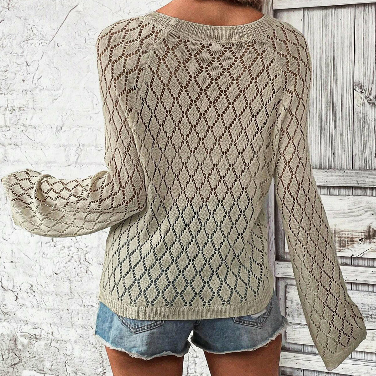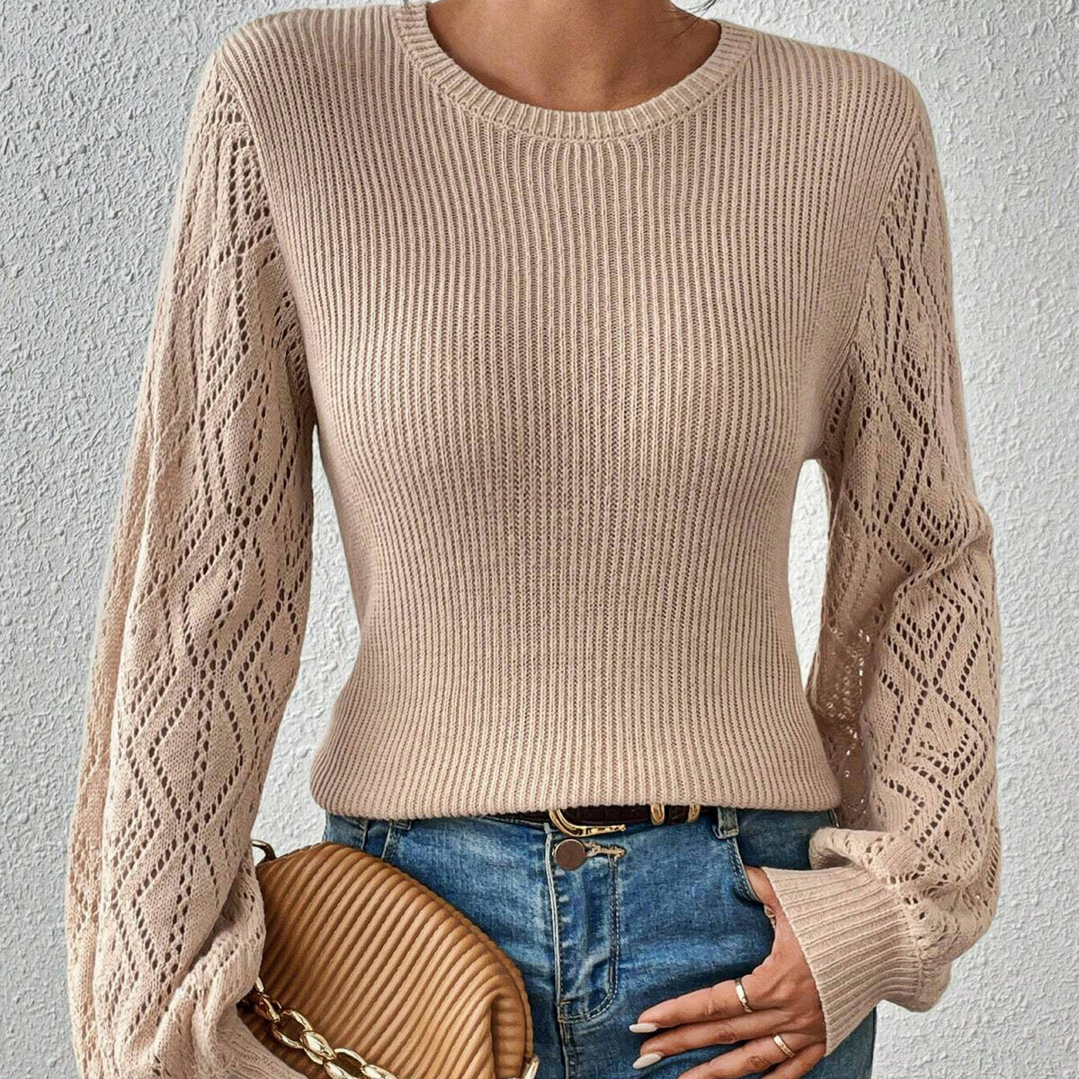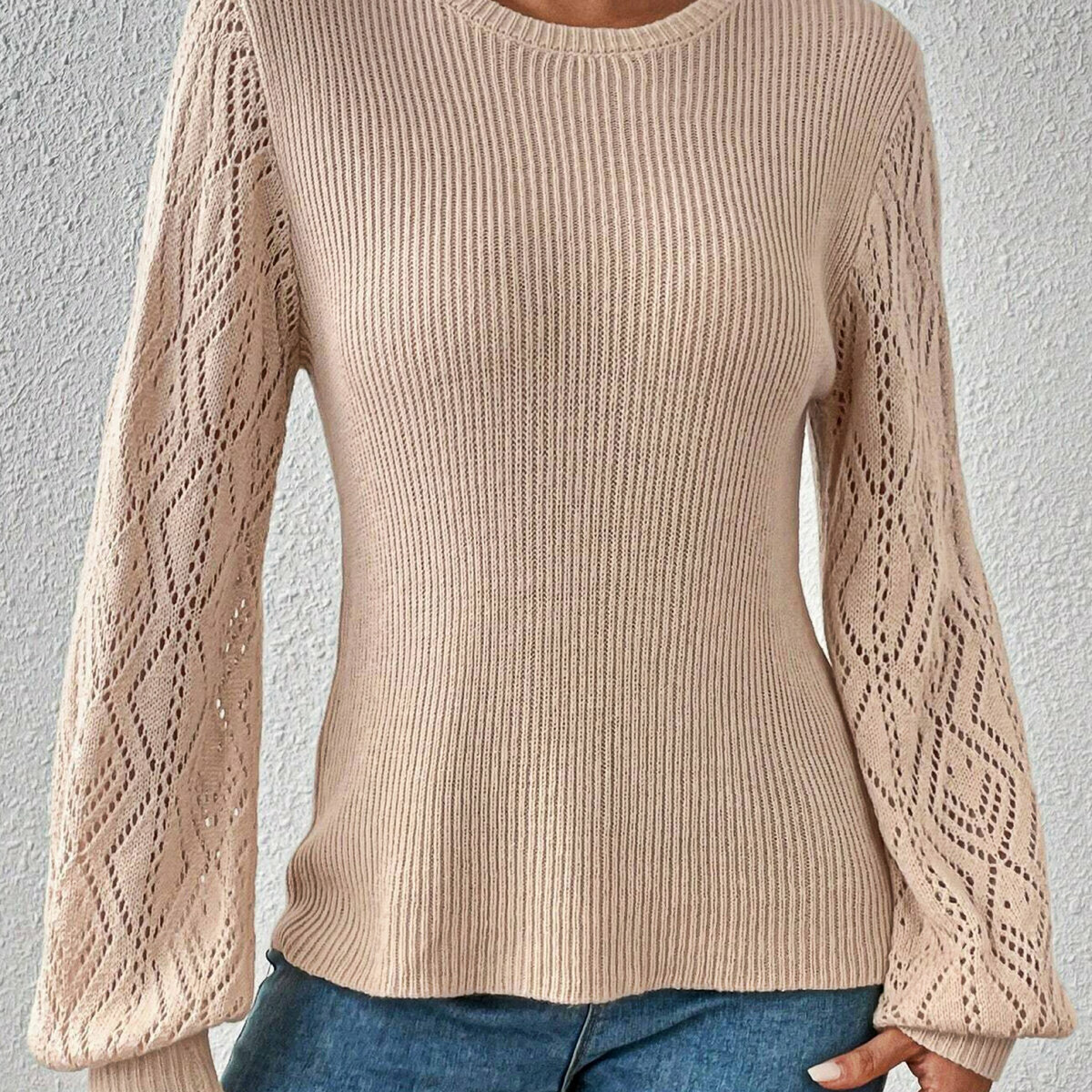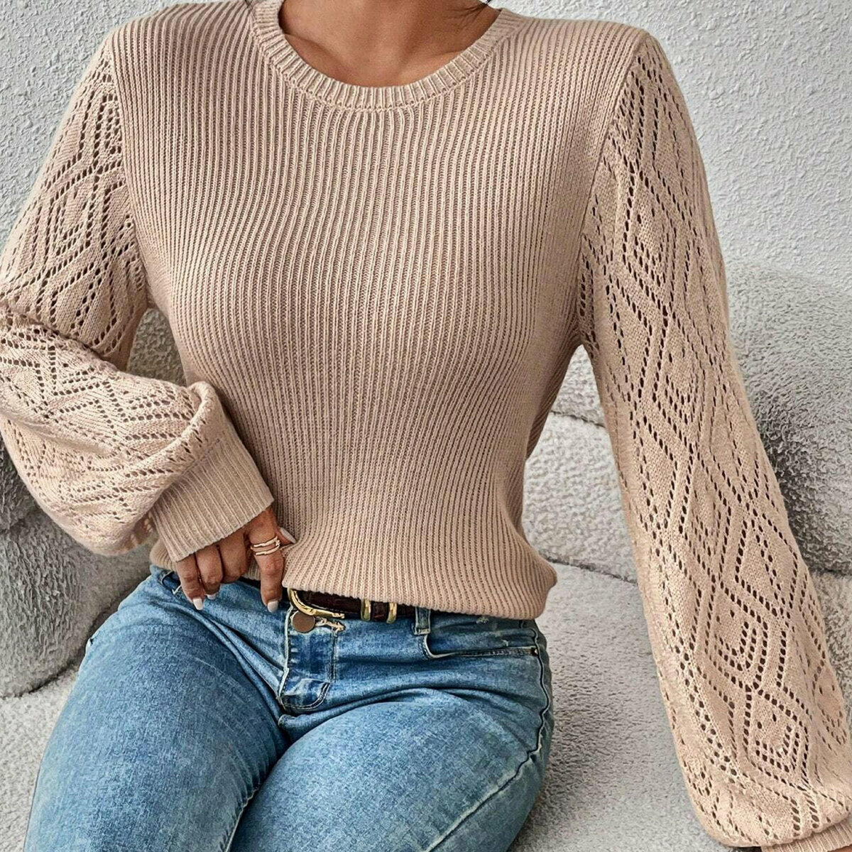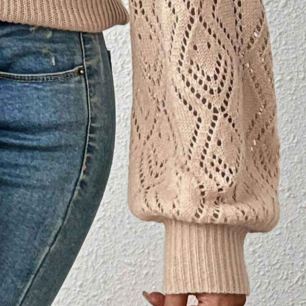 Элегантный пудровый джемпер спицами от Shein. Удлинённая модель свободного кроя с пышными ажурными рукавами на узкой манжете-резинке. Прямой крой, втачной рукав и небольшой круглый вырез горловины.