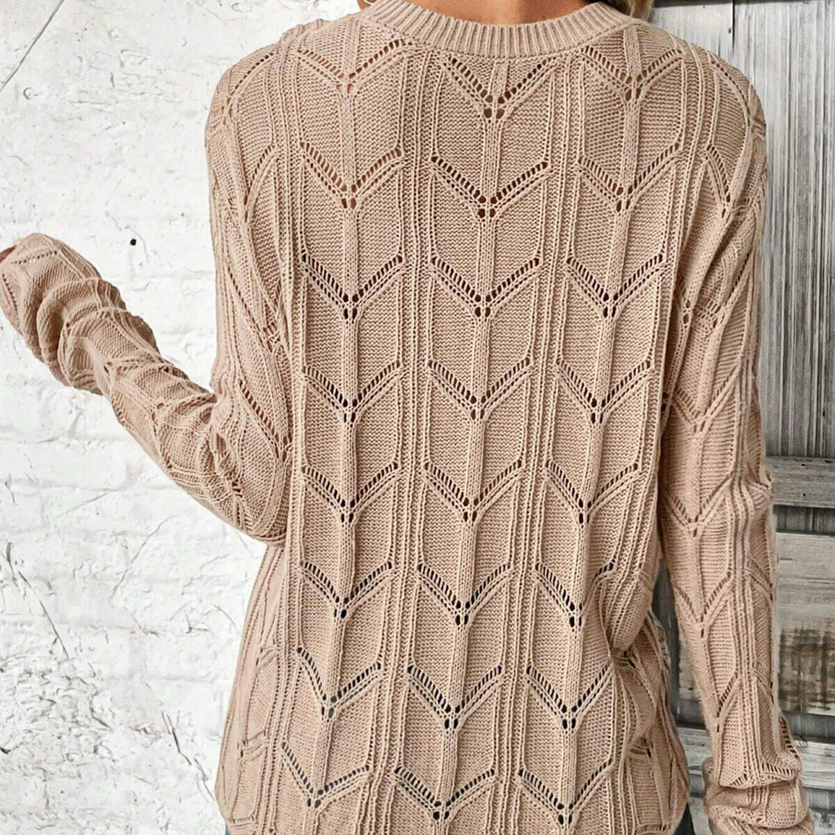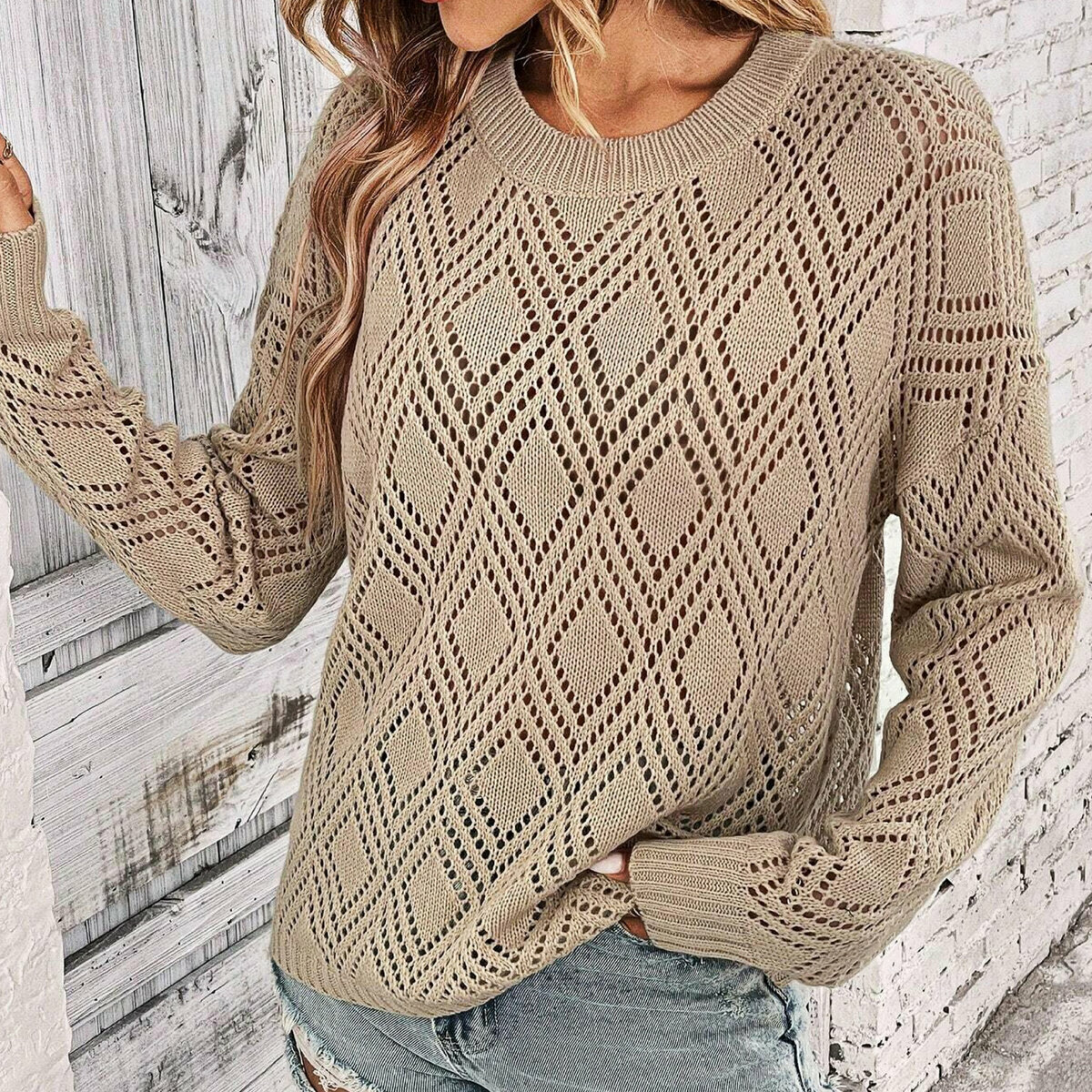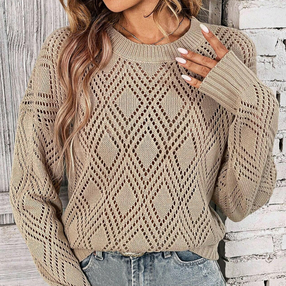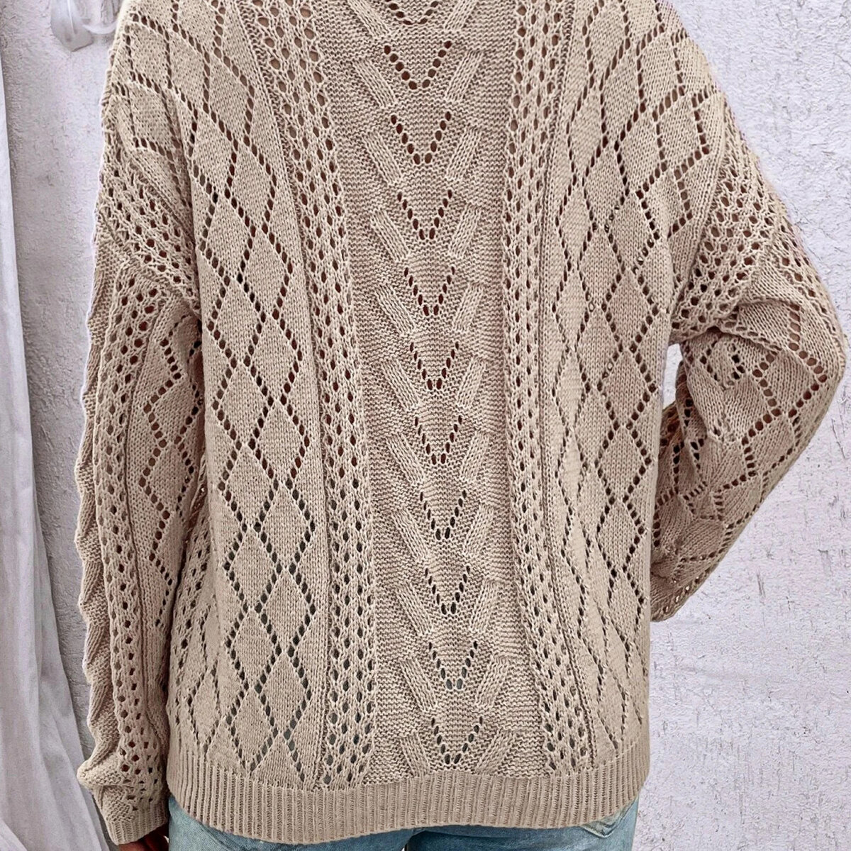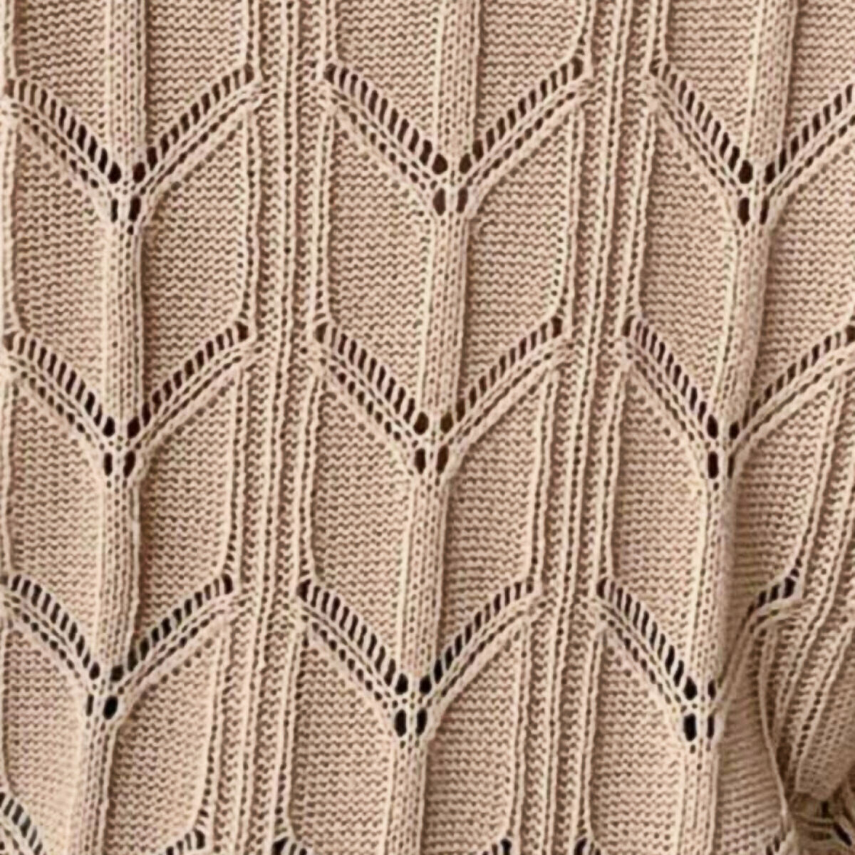 Джемпер оверсайз спицами благородного бежевого цвета, модель китайского бренда Shein. Эффектный ажур из диагональных линий и ромбов. Прямой фасон свободного кроя, спущенный длинный рукав, круглый вырез горловины.