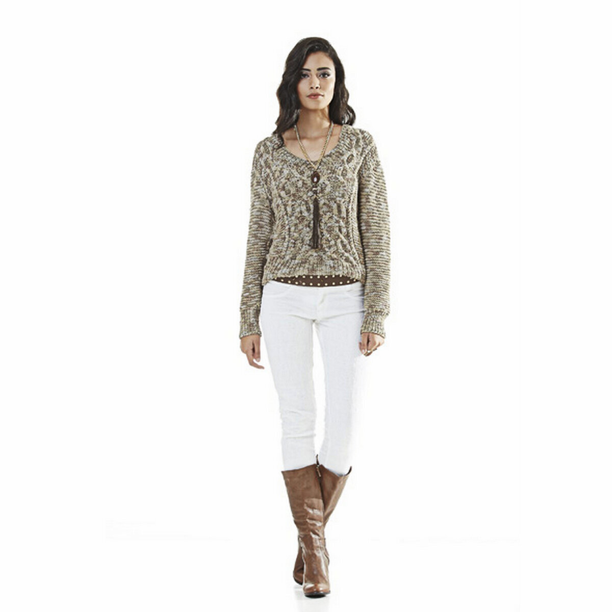 Симпатичный меланжевый пуловер спицами с рельефным узором из жгутов. Рукава и спинка связаны платочной вязкой. Слегка укороченный фасон до талии, спущенная линия плеча, U-образный вырез горловины.