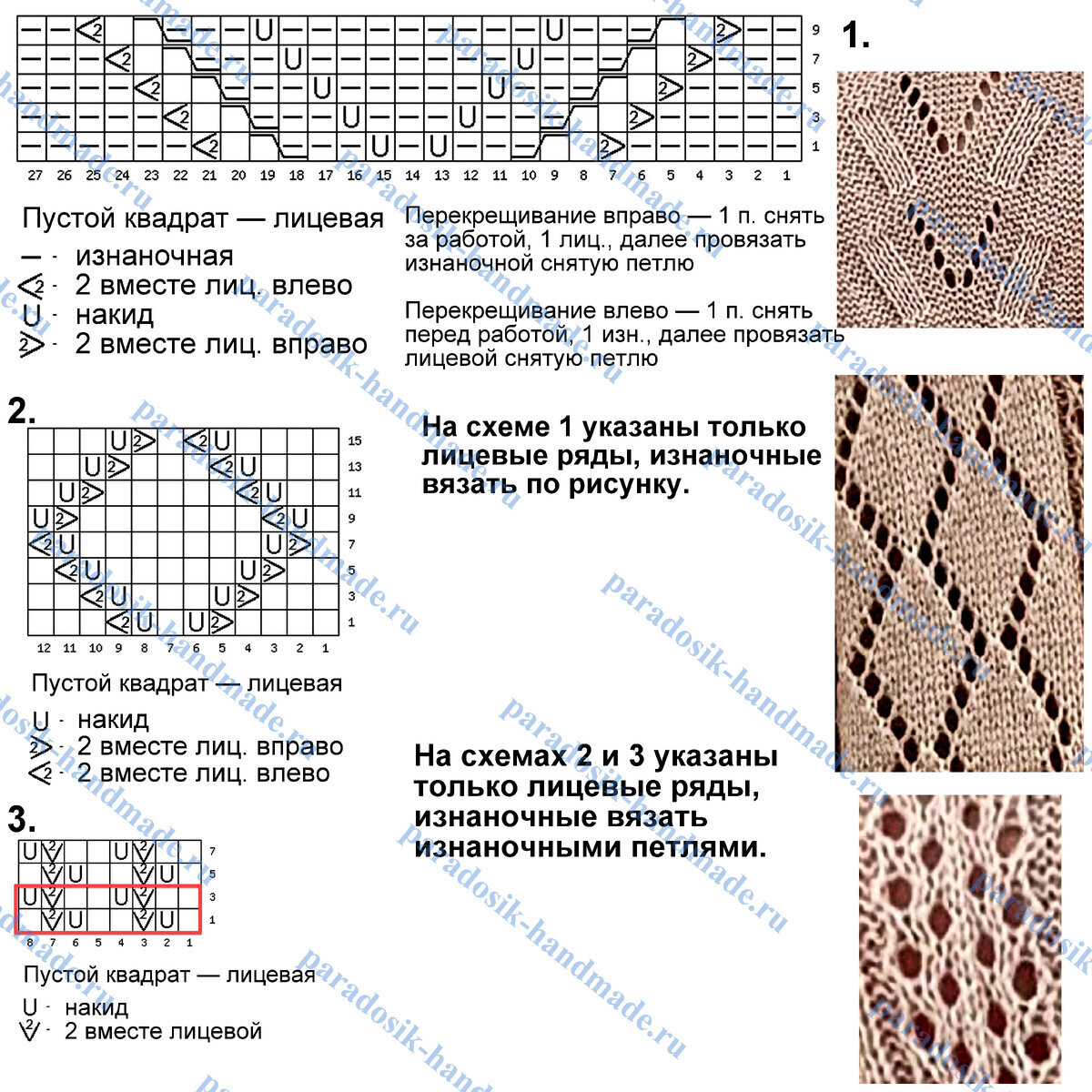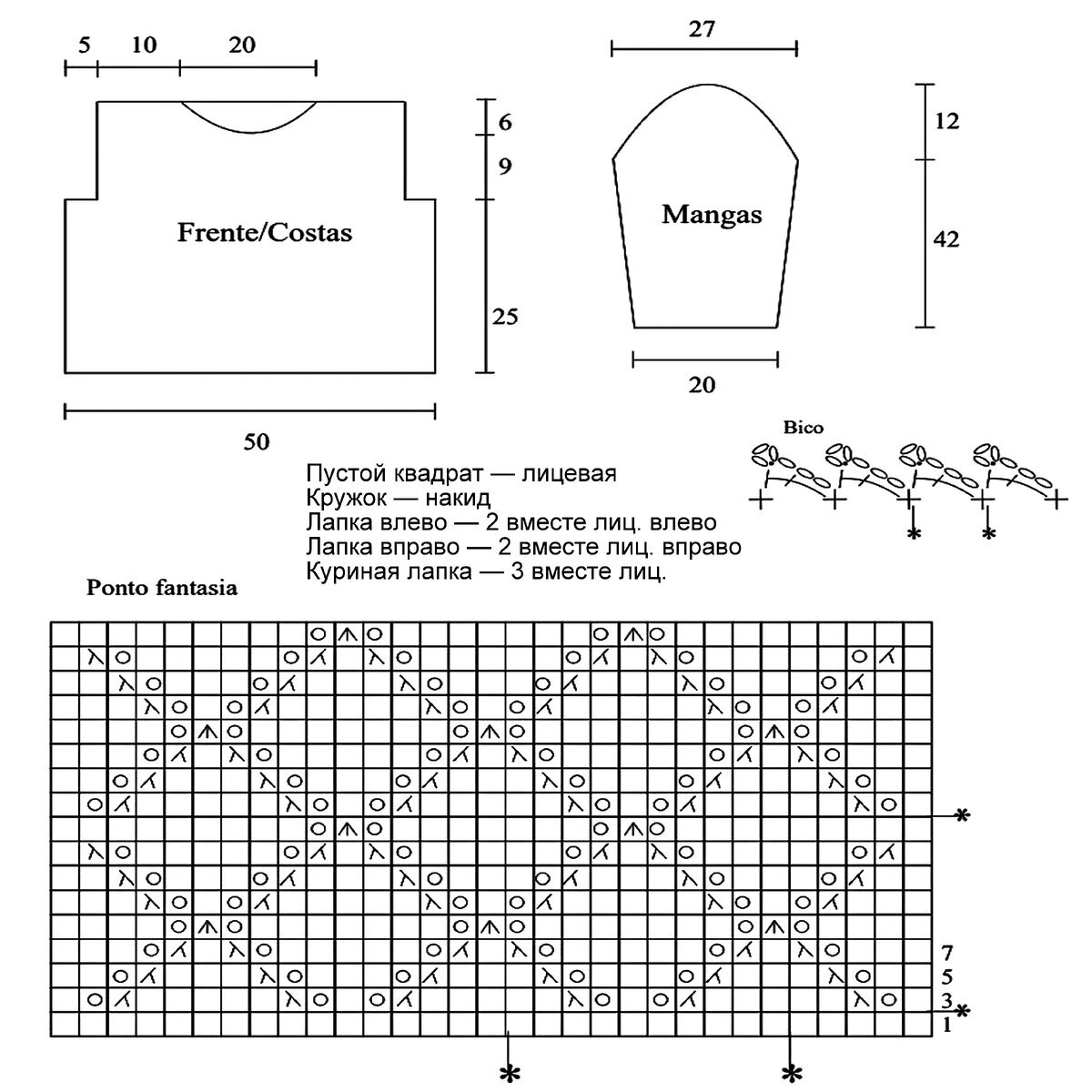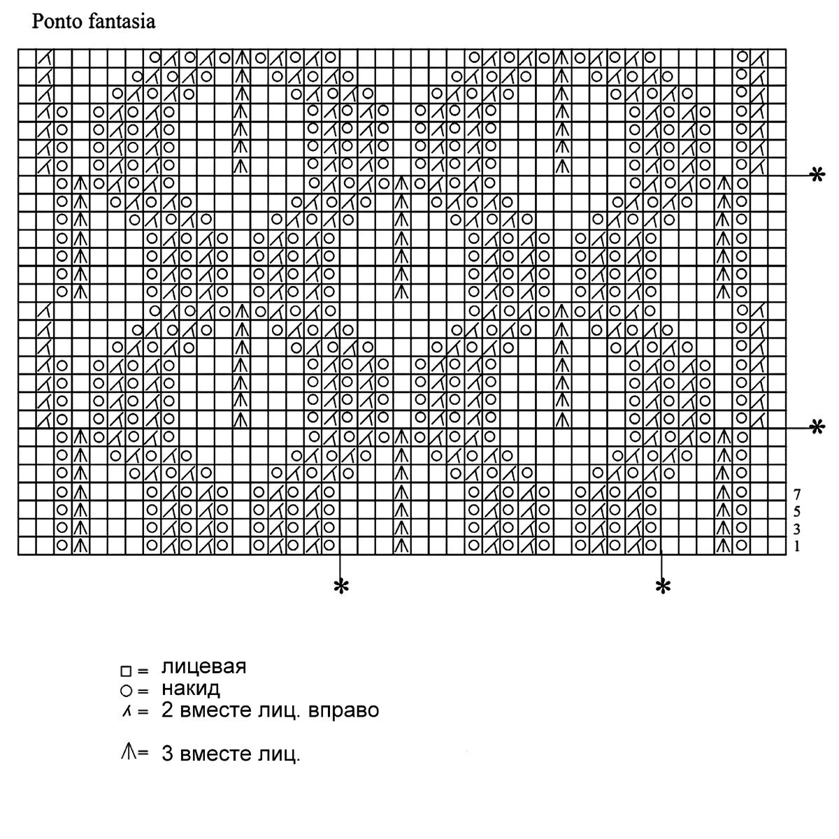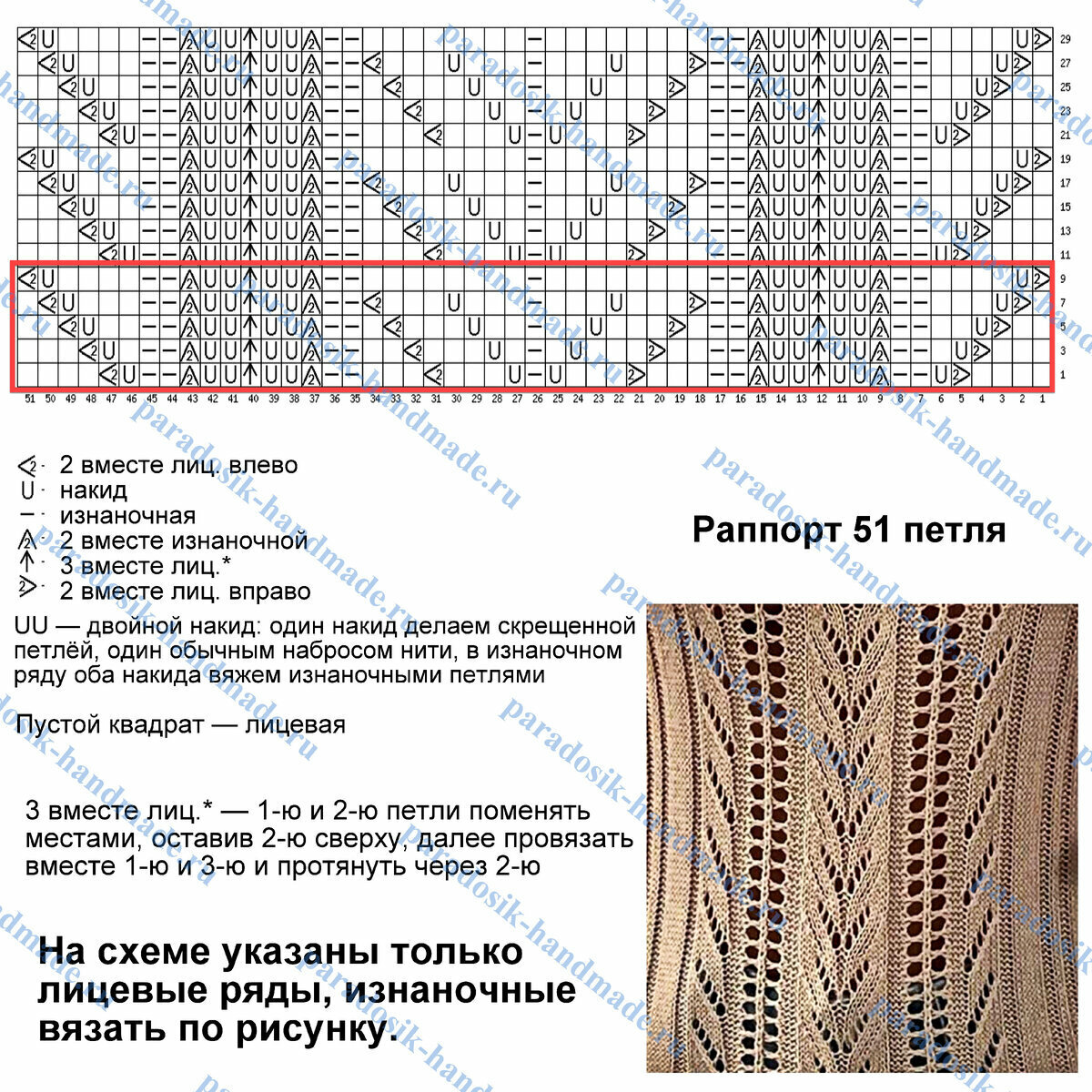 Будьте внимательны с двойными накидами. Если не хочется добавлять излишней дырявости топу, можно опустить по одному накиду справа и слева от «3 вместе лиц.», оставив одинарные. Но тогда не забудьте заменить обозначение «2 вместе изн.», вместо них провязывая просто изнаночную петлю. Без двойных накидов раппорт узора составит 47 петель.