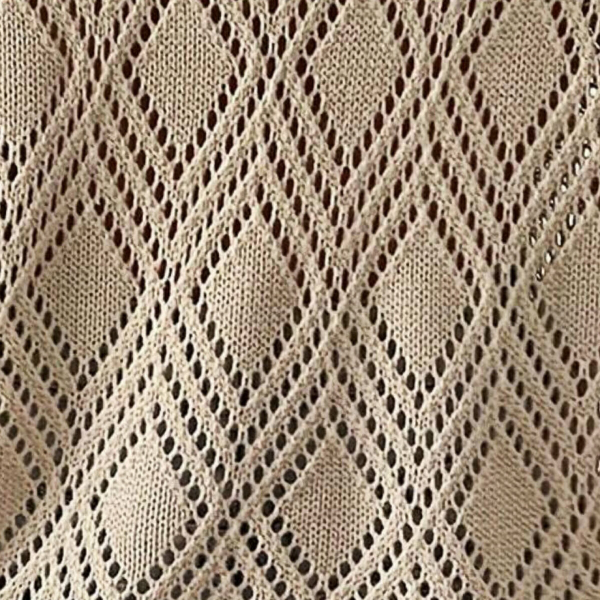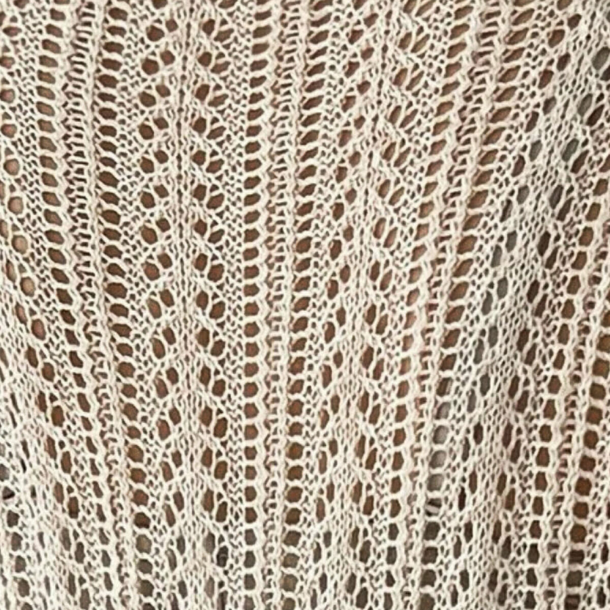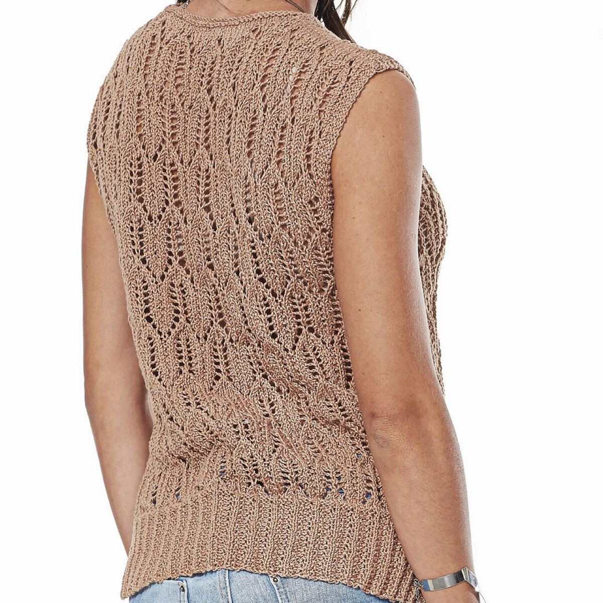Золотисто-бежевый топ спицами с крупным ажурным узором. Удлинённая модель прямого кроя, без рукавов, небольшой круглый вырез горловины.