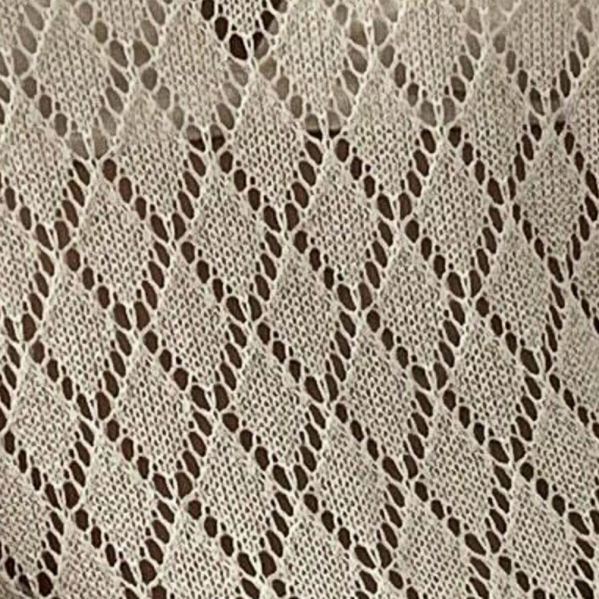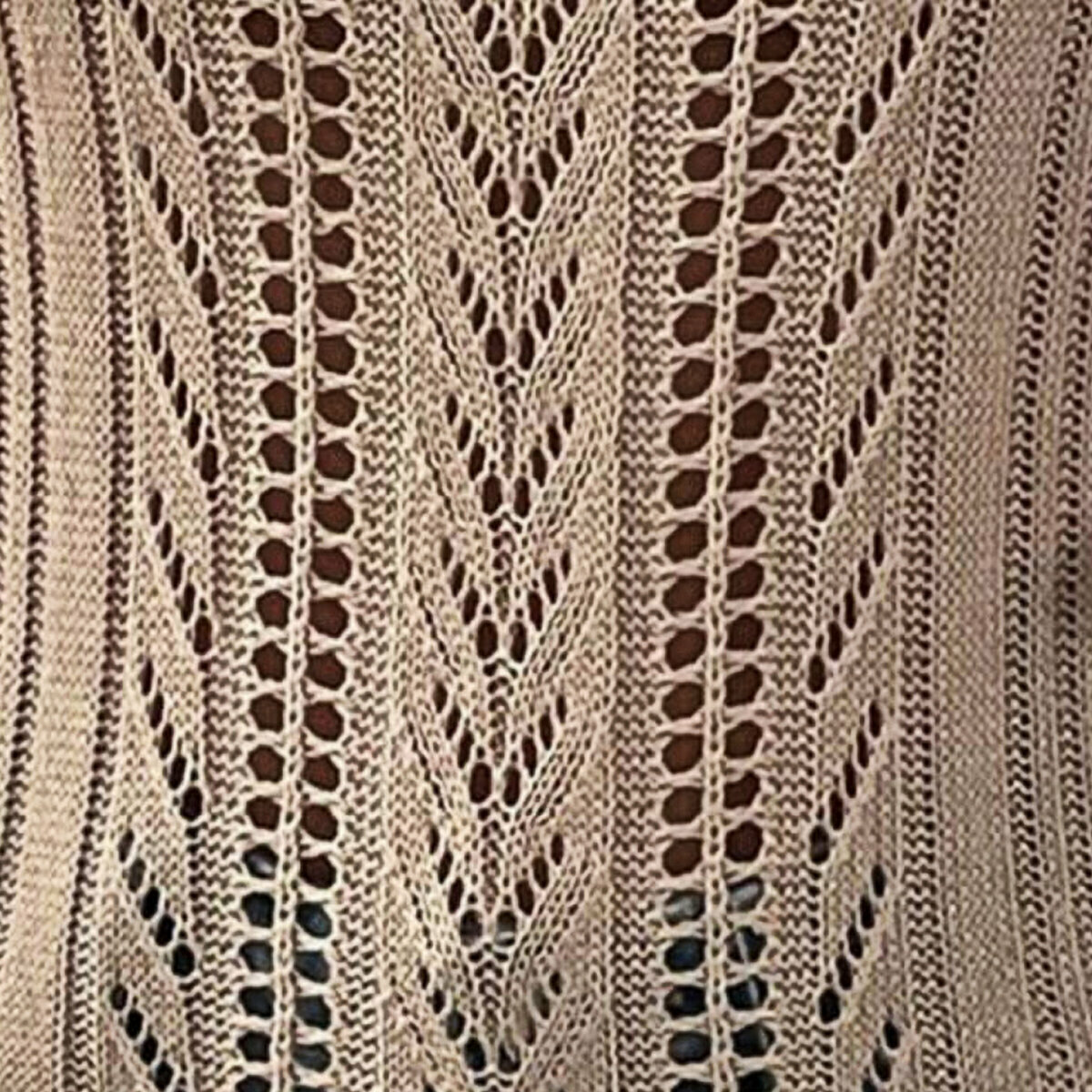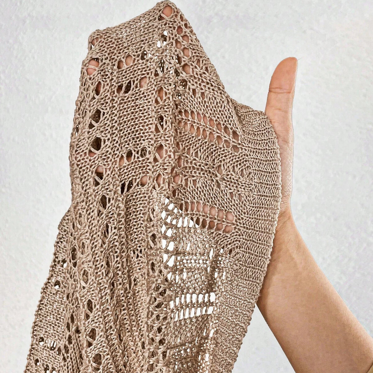 Золотисто-бежевый топ спицами с крупным ажурным узором. Удлинённая модель прямого кроя, без рукавов, небольшой круглый вырез горловины.