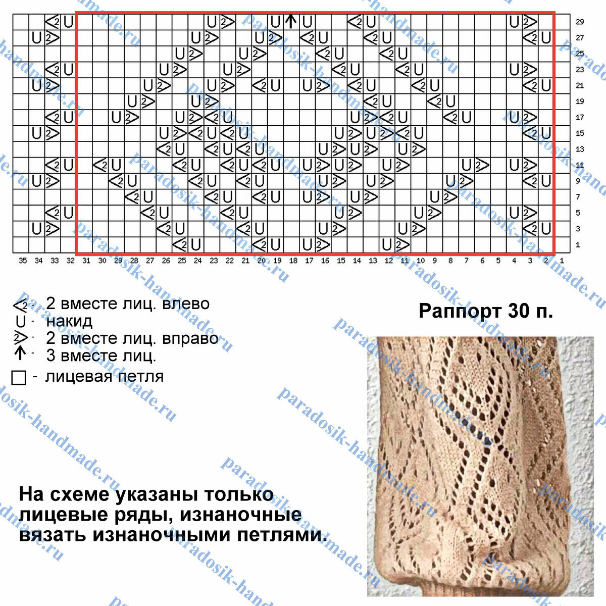 Раппорт узора 30 петель и 30 рядов в высоту. На схеме указаны только лицевые (нечётные) ряды, изнаночные (чётные) вязать изнаночными петлями.