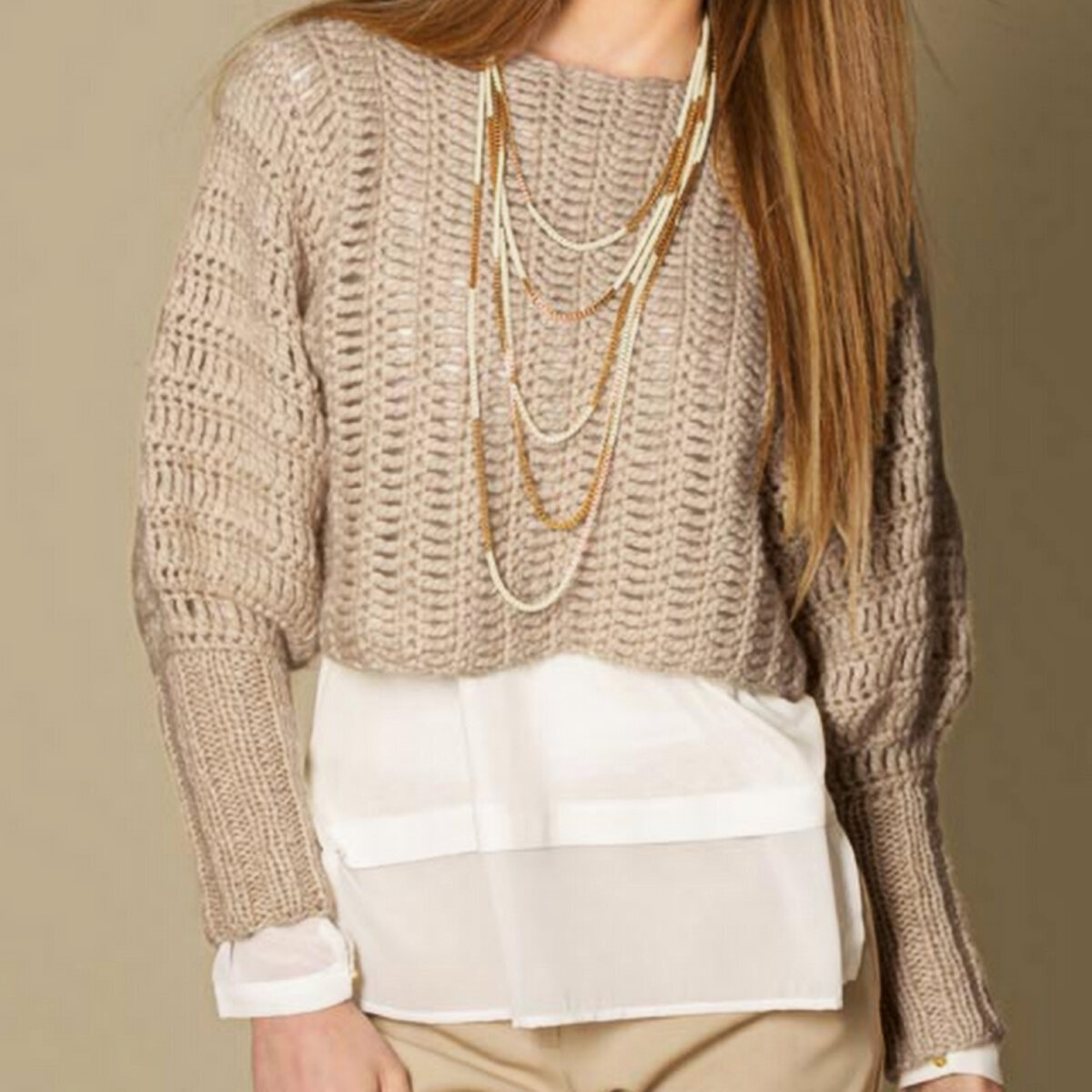 Молочно-бежевый топ спицами свободного кроя, длина до середины бедра. Спущенный рукавчик за счёт оригинальной кокетки. Женственная и одновременно универсальная модель (как практически всё у японок, надо сказать).
