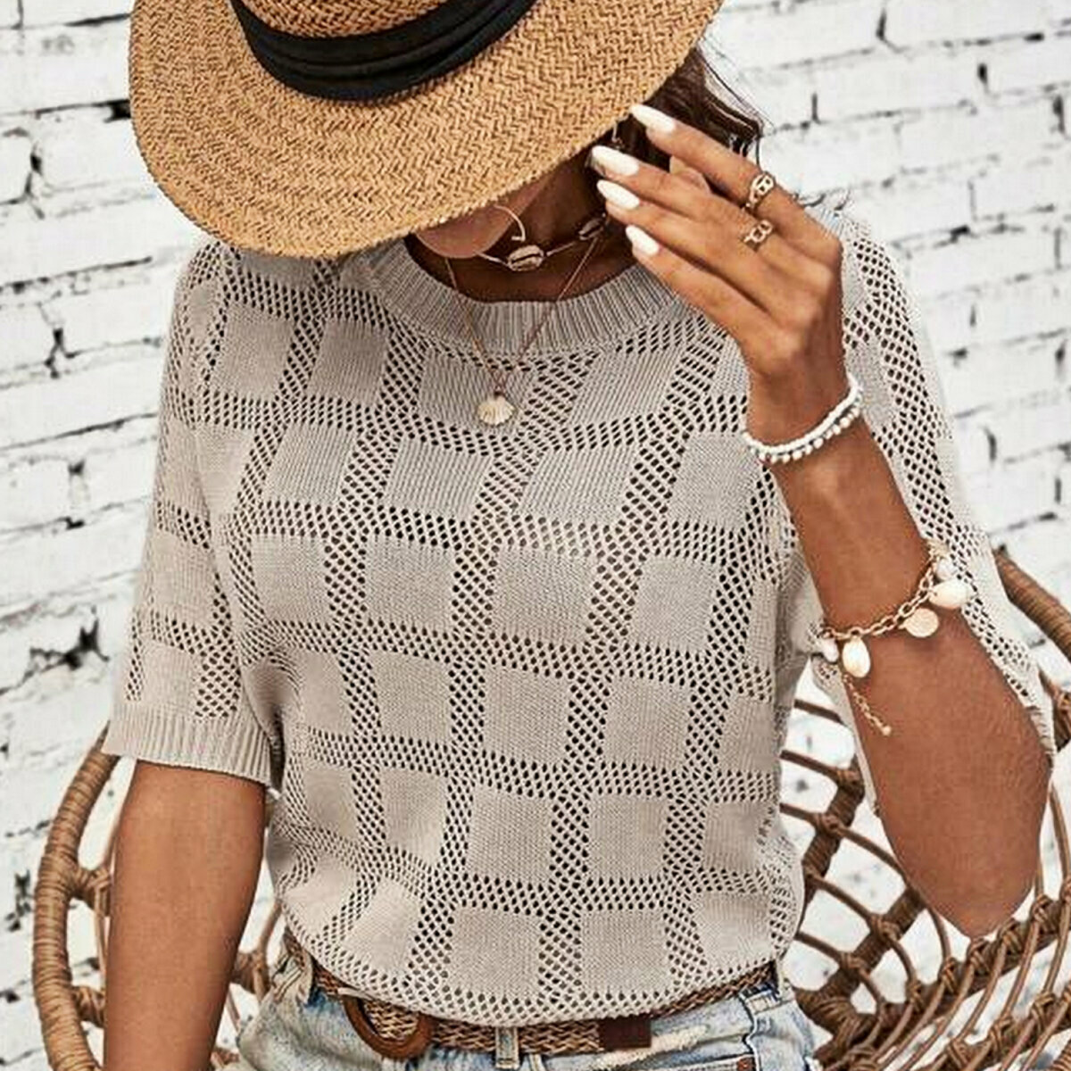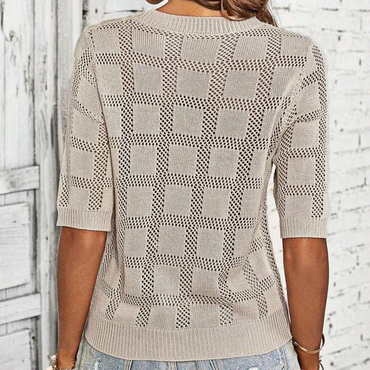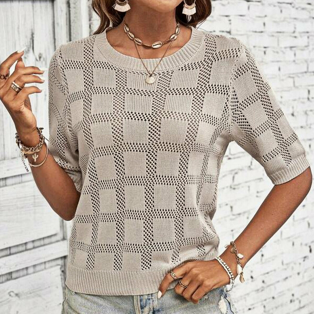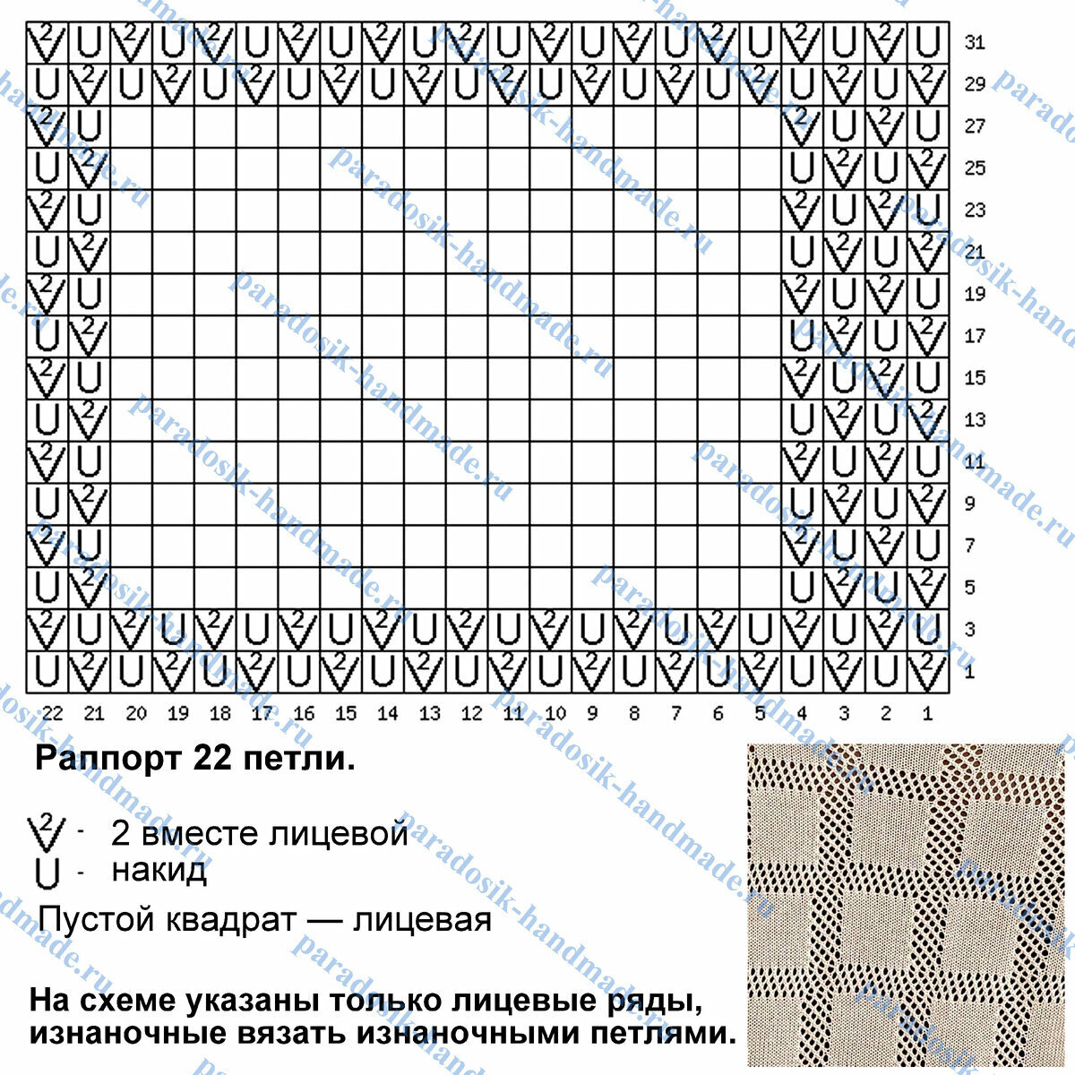 Прямой фасон, круглый вырез горловины, втачной рукавчик выше локтя, простой и одновременно эффектный узор из квадратов на фоне ажурной сетки.
