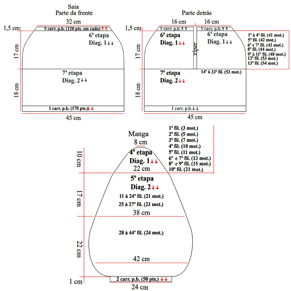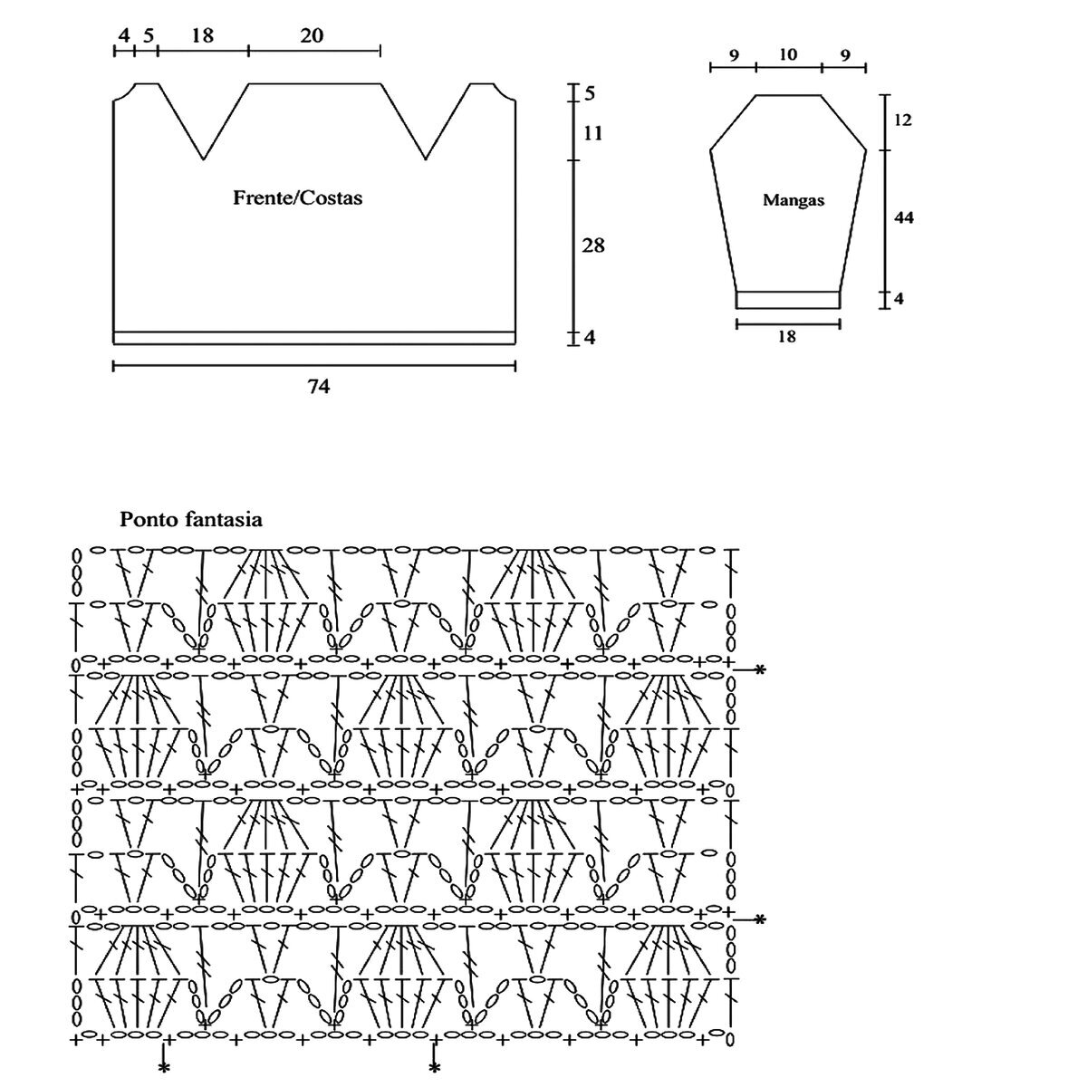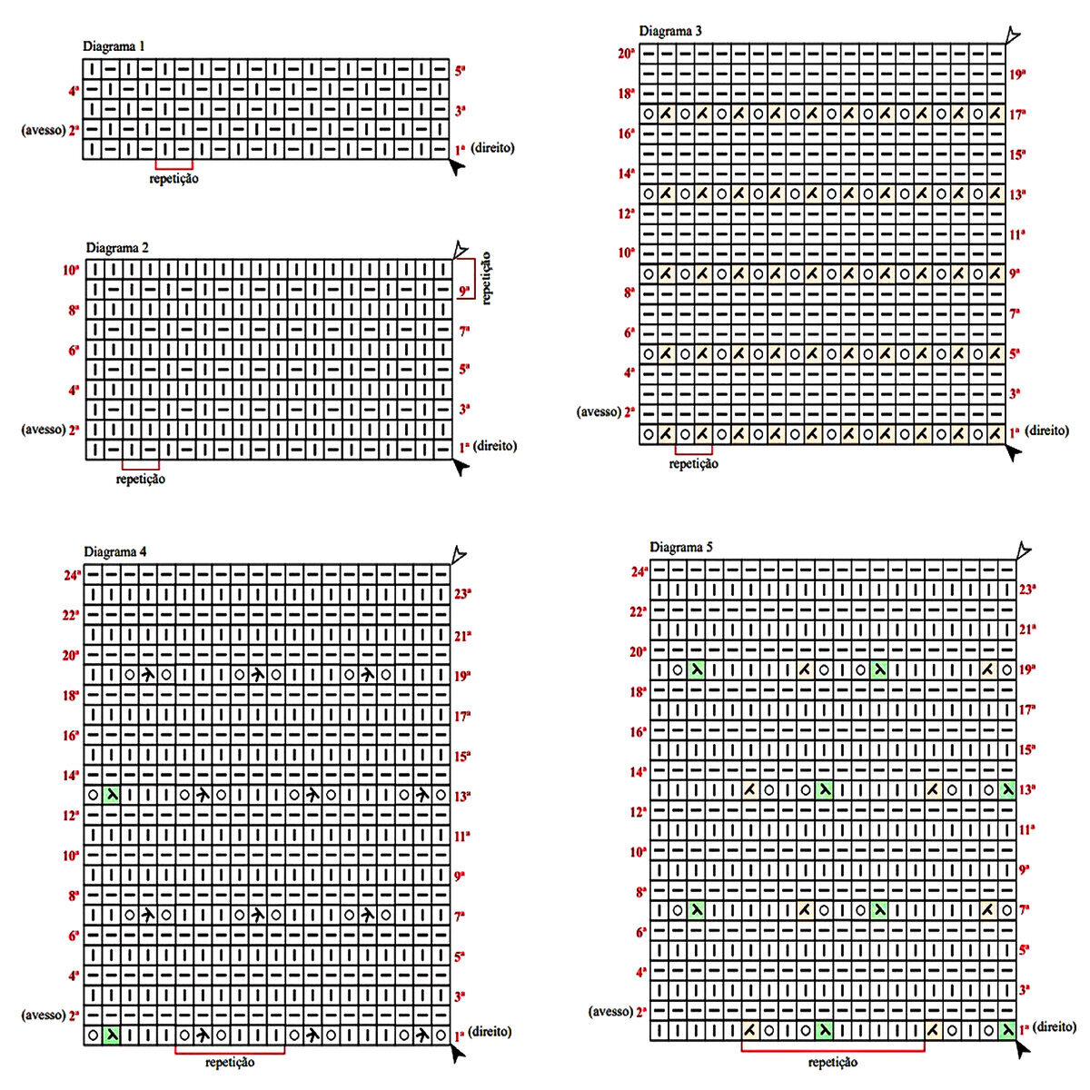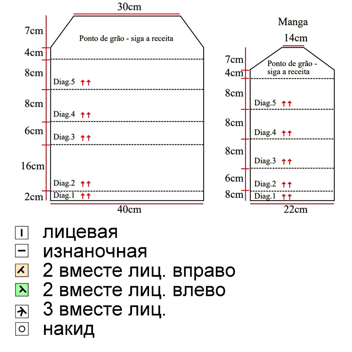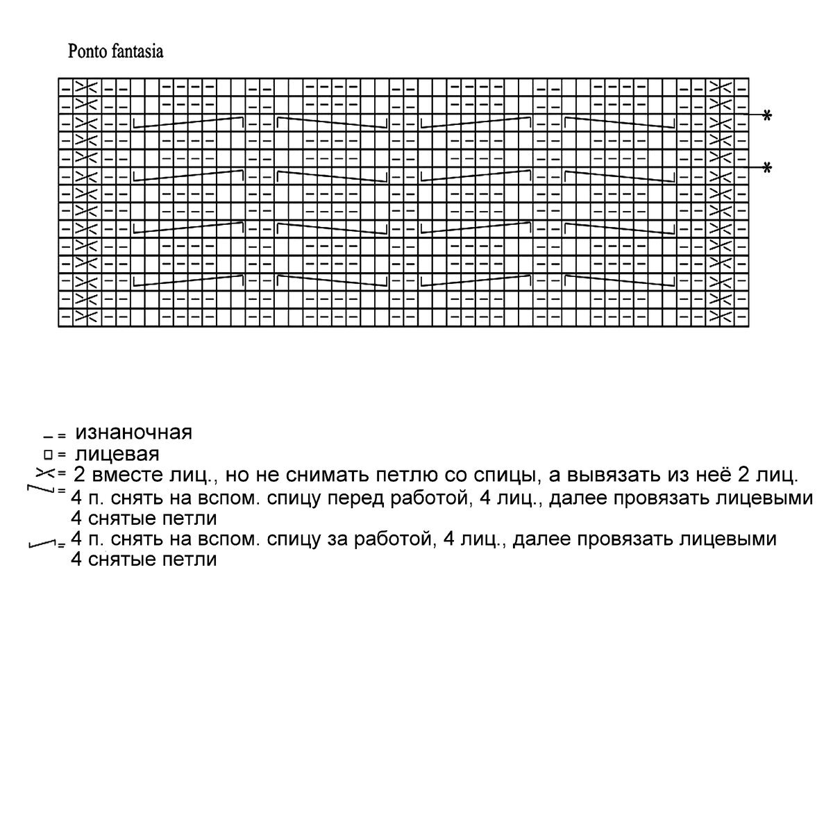 И перед, и спинка, у рукава вяжутся одним и тем же узором. Вернее, сочетанием нескольких узоров. Составила схемы. Между собой узоры разделены изнаночными петлями (количество изнаночных петель я условно ставлю по 2 п., но вы можете добавить столько, сколько вам больше нравится).