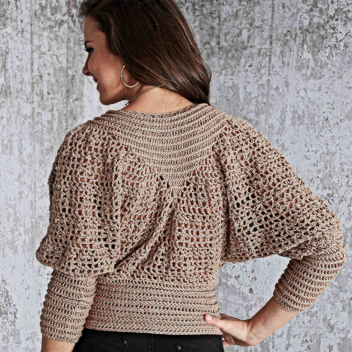 Сетчатая бежевая блузка крючком с рукавами а-ля «летучая мышь». Необычный и очень простой в исполнении фасон — вяжем как большую круглую кокетку, складываем пополам и надвязываем рукава и нижнюю часть блузки столбиками с накидом.