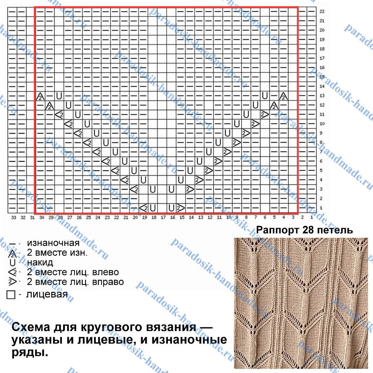 Раппорт узора 28 петель и 22 ряда в высоту. Обратите внимание, что схема для кругового вязания — указаны и лицевые, и изнаночные ряды!