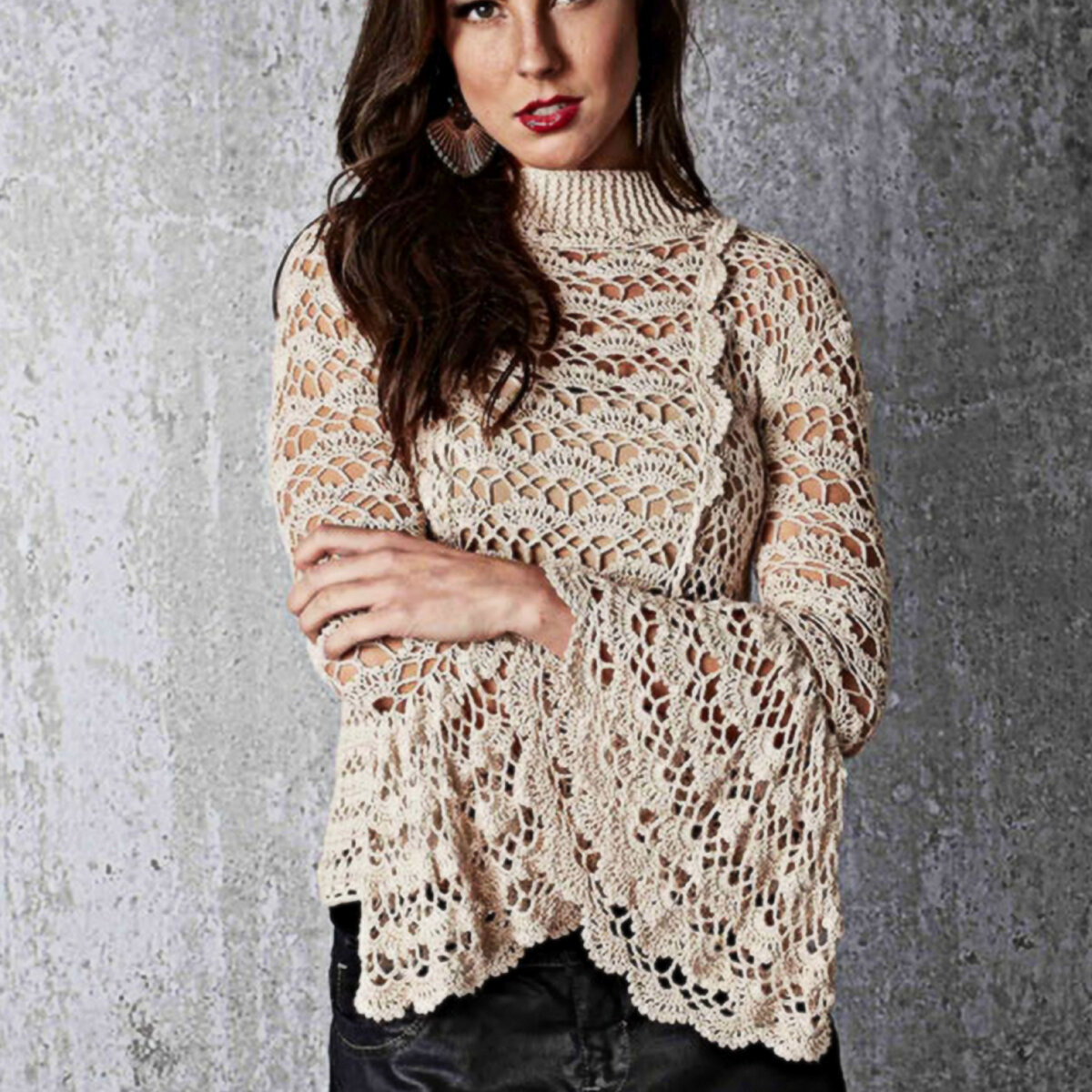 Кремово-бежевый джемпер крючком с крупной фестончатой отделкой, модель из Бурды. Прямой фасон чуть ниже пояса, слегка спущенный рукав, круглый вырез горловины.