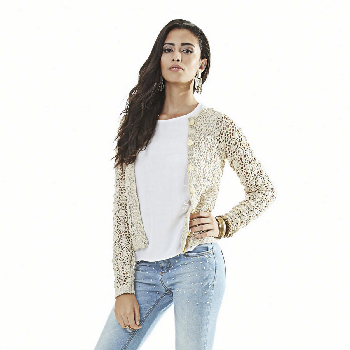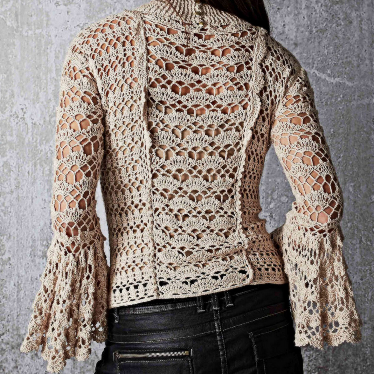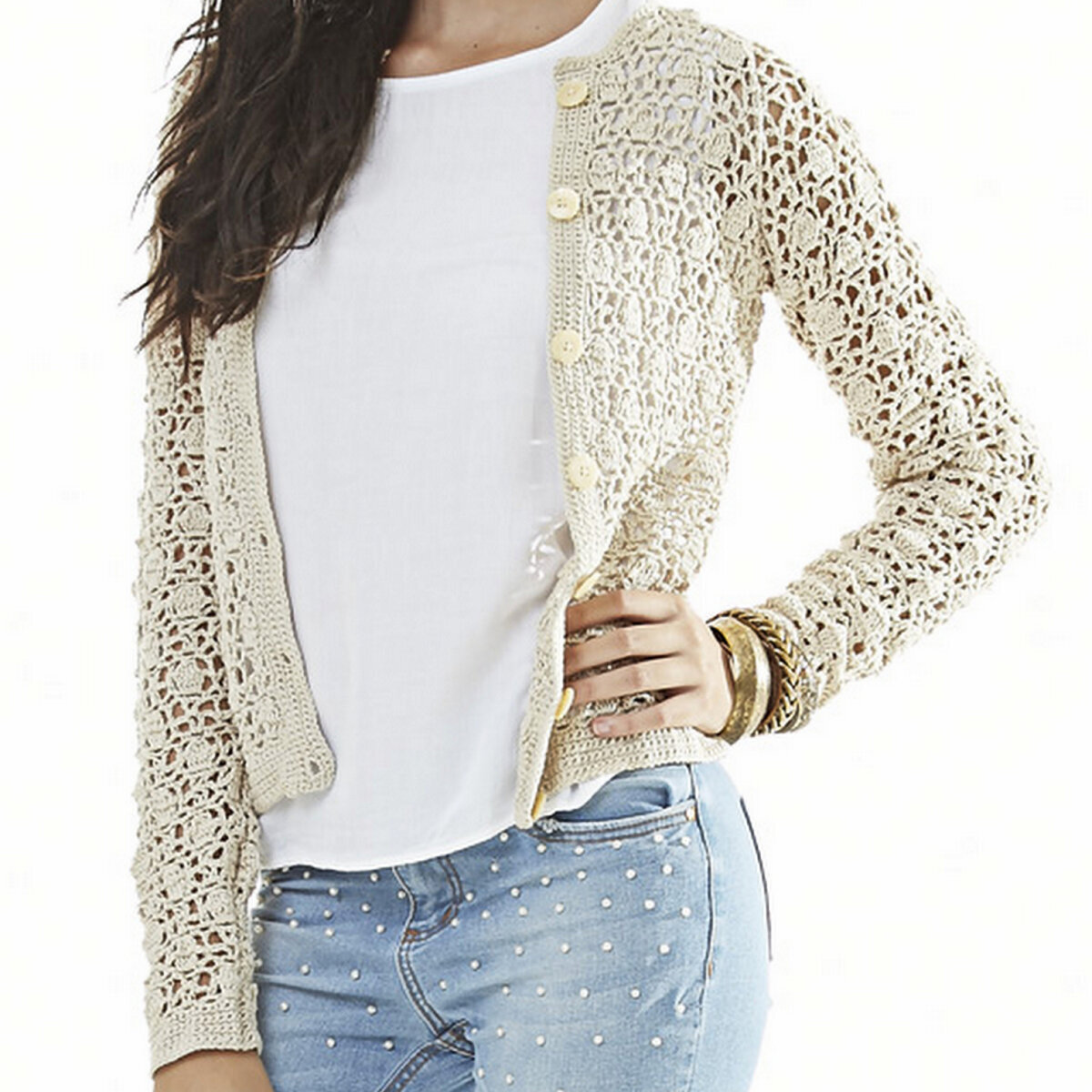 Кремово-бежевый кардиган крючком в стиле французской кофточки — «ягодный» ажурный узор, длинные зауженные рукава, маленький круглый вырез горловины.
